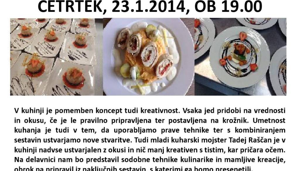 Sofija LendavaV kuhinji je pomemben koncept tudi kreativnost. Vsaka jed pridobi na vrednosti in okusu, če je le pravilno pripravljena ter postavljena na krožnik. Umetnost kuhanja je tudi v tem, da uporabljamo prave tehnike ter s kombiniranjem sestavin ustvarjamo nove stvaritve. Tudi mladi kuharski mojster Tadej Raščan je v kuhinji nadvse ustvarjalen z okusi in nič manj kreativen s tistim, kar pričara očem. Na delavnici nam bo predstavil sodobne tehnike kulinarike in mamljive kreacije, obrok pa pripravil iz naključnih sestavin, s katerimi ga bomo presenetili.