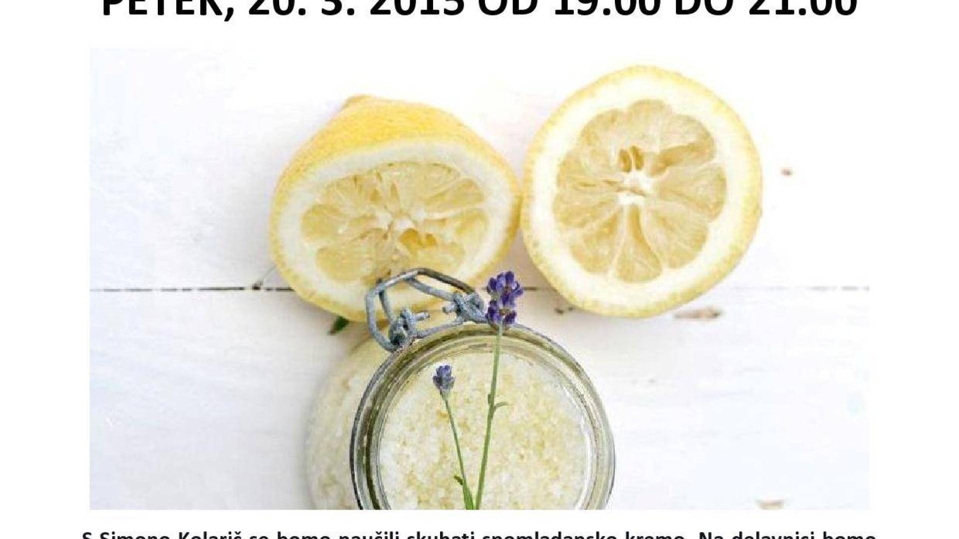 Sofija medgeneracijska hiša Lendava Glavna ulica 48 9220 LendavaS Simono Kolarič se bomo naučili skuhati spomladansko kremo. Na delavnici bomo deležne pravega dišečega spomladanskega razvajanja z vonjem limone, pomaranče, bergamotke in vrtnice, ter vonji, ki se že spogledujejo s poletno sivko in opojno vanilijo. Vsaka udeleženka dobi kremico za domov (5-10ml) in recepte pripravljenih krem.
