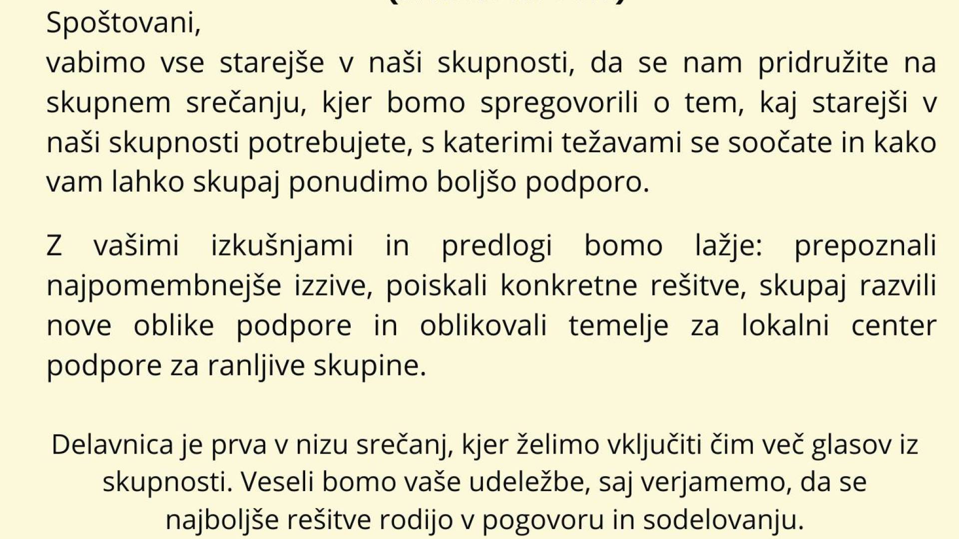vabimo vse starejše v naši skupnosti, da se nam pridružite na skupnem srečanju, kjer bomo spregovorili o tem, kaj starejši v naši skupnosti potrebujete, s katerimi težavami se soočate in kako vam lahko skupaj ponudimo boljšo podporo.