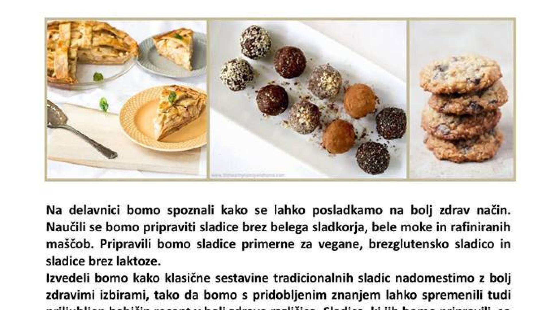 Na delavnici bomo spoznali kako se lahko posladkamo na bolj zdrav način. Naučili se bomo pripraviti sladice brez belega sladkorja, bele moke in rafiniranih maščob. Pripravili bomo sladice primerne za vegane, brezglutensko sladico in sladice brez laktoze.