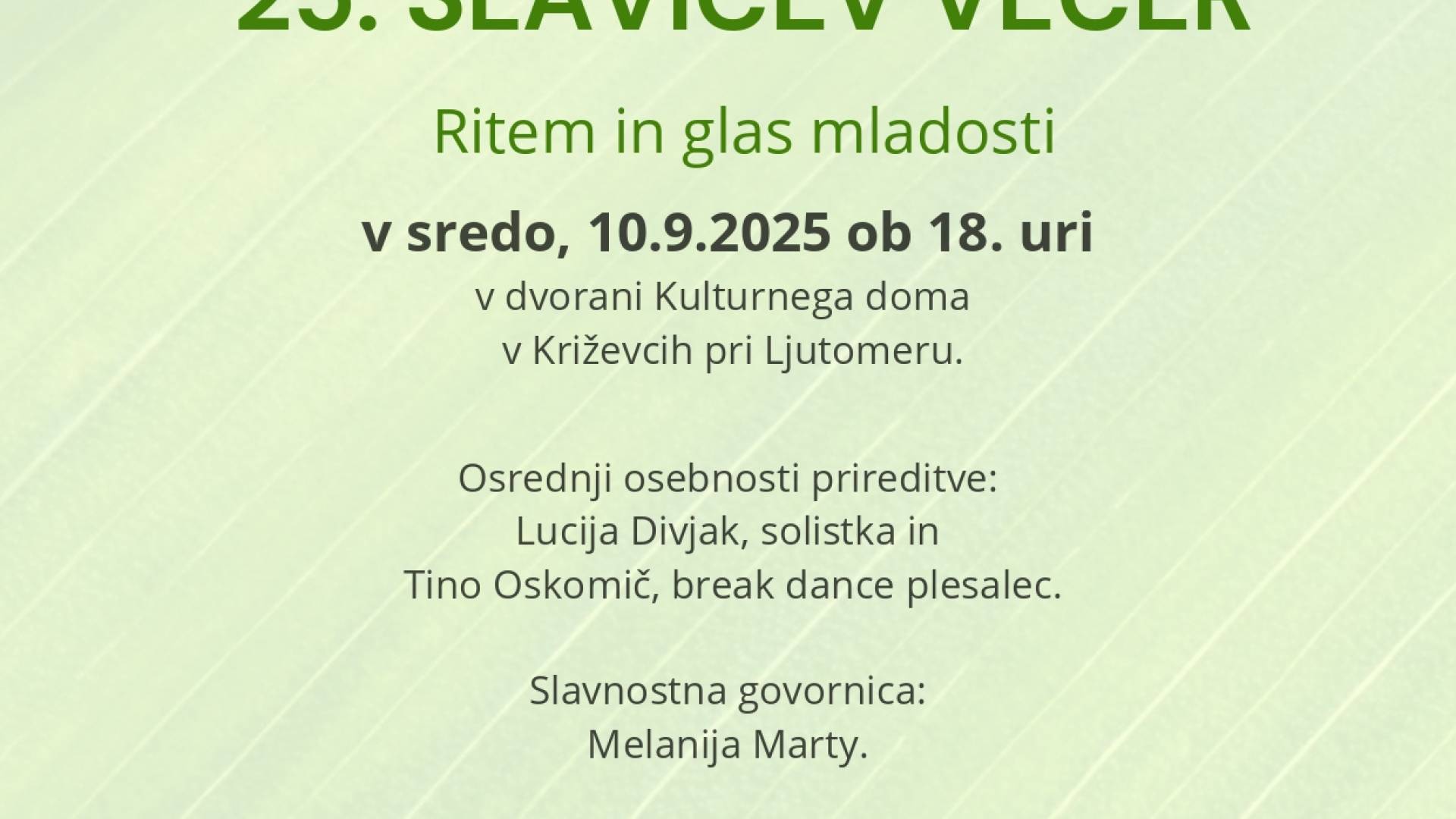 Kulturni dom Križevcih pri LjutomeruV sredo, 10.9.2025 ob 18. uri v dvorani Kulturnega doma v Križevcih pri Ljutomeru.