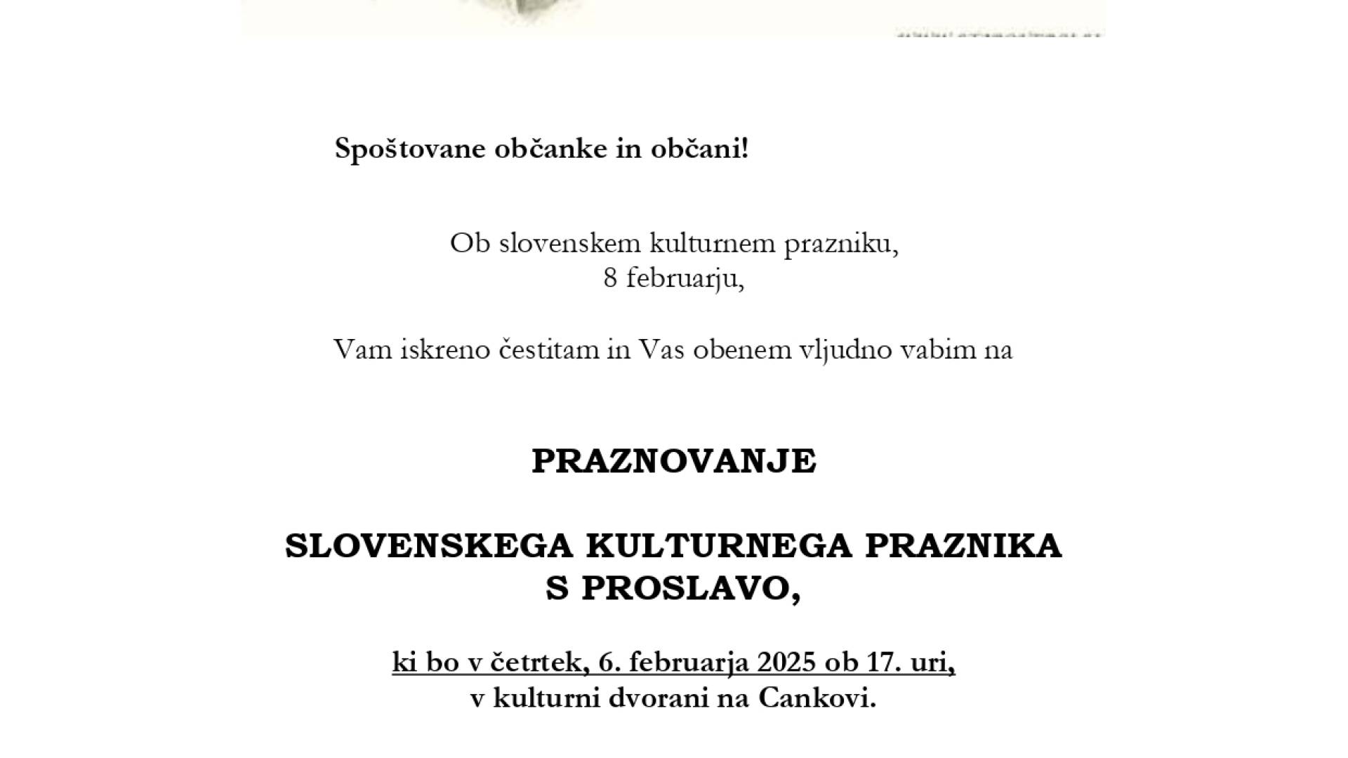 Vljudno vabljeni na počastitev 🇸🇮Slovenskega kulturnega praznika🇸🇮, ki bo v četrtek, 6. februarja 2025 ob 17. uri v kulturni dvorani na Cankovi