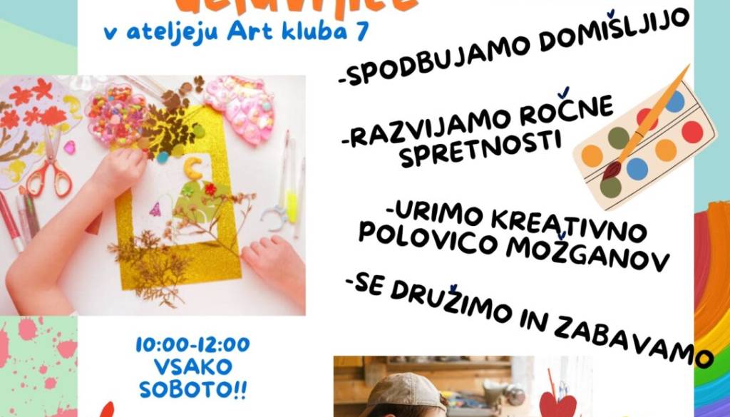 Atelje Art kluba 7Društvo Art klub 7 vabi otroke na ustvarjalne sobotne delavnice, kjer bodo spodbujali svojo domišljijo, ročne spretnosti in umetniško izražanje v varnem in spodbudnem okolju. Delavnice bodo potekale vsako soboto med 10. in 12. uro v Ateljeju Art kluba 7.