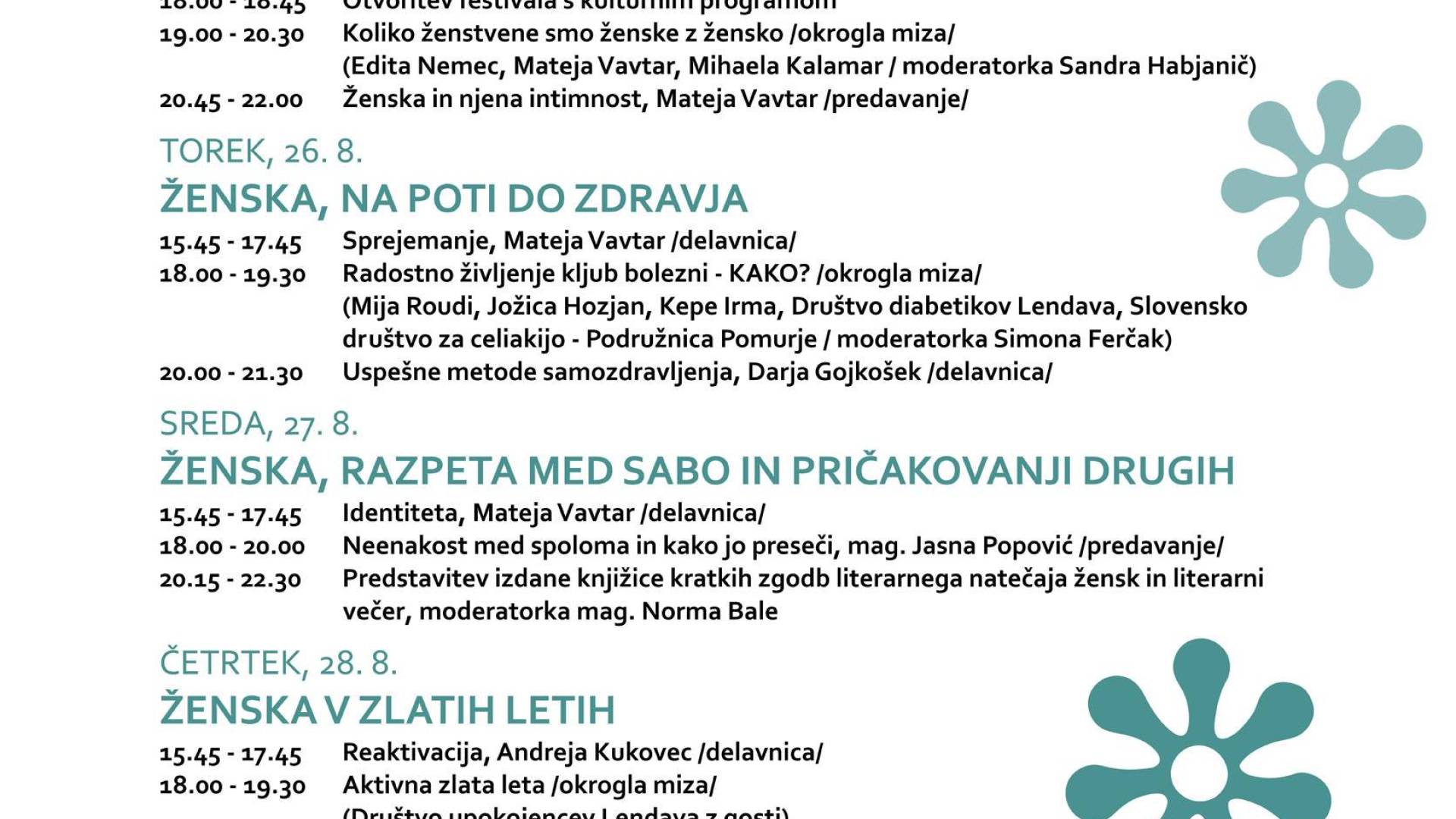 Vsak dan Sofijinega festivala bo tako različno tematsko obarvan in bo ženskam skozi različne delavnice, okrogle mize, debate ter ostale aktivnosti omogočil druženje, izmenjavo mnenj in osebnih izkušenj. V sklopu festivala se bomo dotaknili različnih tematik: kako biti ženska, ženske na poti do zdravja, ženske razpete med sabo in pričakovanji drugih, ženske v zlatih letih, ženske narodnostnih in etničnih skupin.