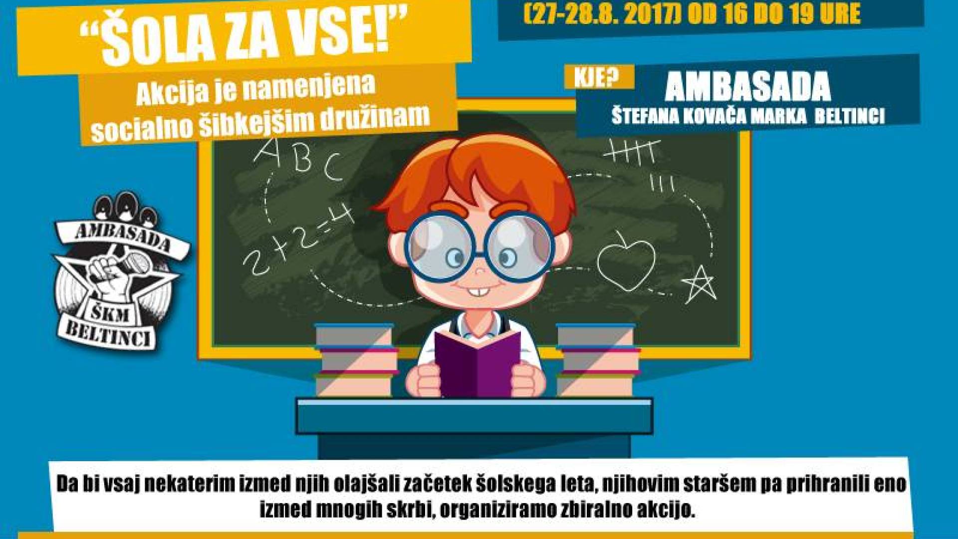 V nedeljo in ponedeljek (27. - 28. avgust), med 16.00 in 19.00, bomo v Ambasadi Štefana Kovača - Marka Beltinci v sodelovanju z društvom Prijlika zbirali šolske potrebščine za socialno šibkejše družine iz lokalnega okolja.