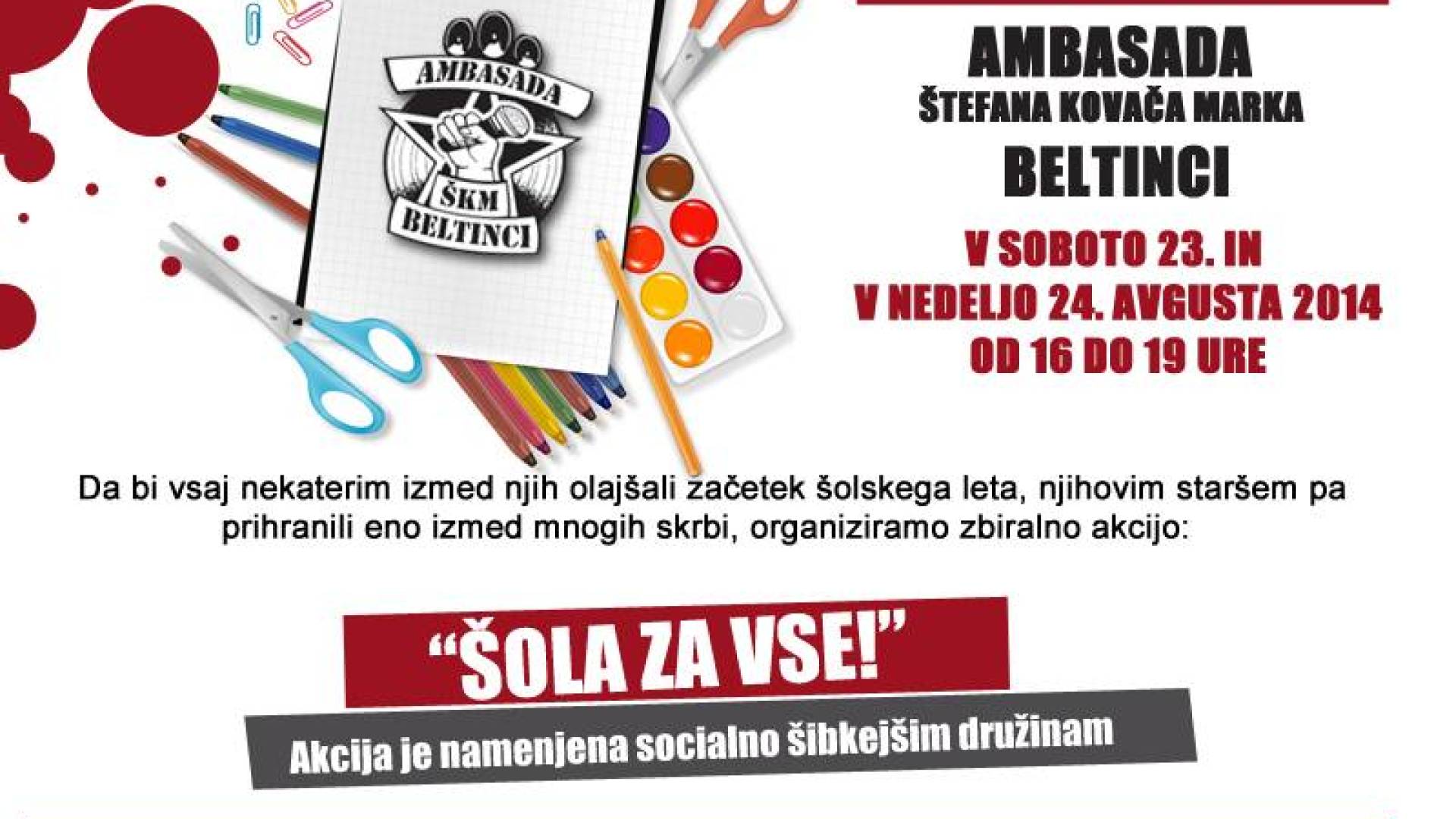 V soboto in nedeljo (23. - 24. avgust), med 16.00 in 19.00, bomo v Ambasadi Štefana Kovača Marka Beltinci zbirali šolske potrebščine za socialno šibkejše družine iz lokalnega okolja. Odprimo svoja srca in izkažimo solidarnost s tistimi, ki si tovrstne dobrine, še posebej v teh, zmeraj hujših časih, le stežka privoščijo.