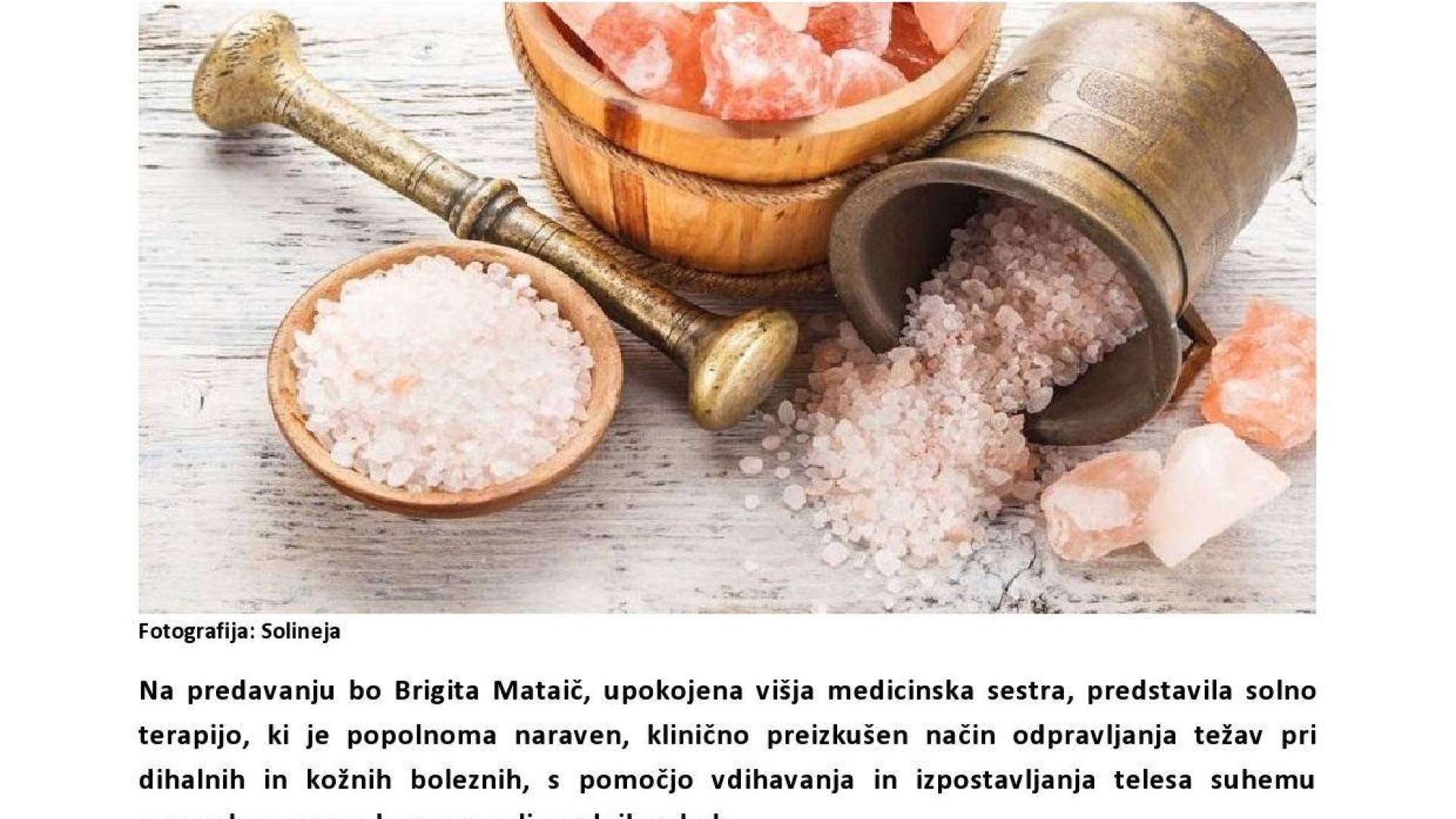 Sofija medgeneracijska hiša Lendava Glavna ulica 48 9220 LendavaNa predavanju bo Brigita Mataič, upokojena višja medicinska sestra, predstavila solno terapijo, ki je popolnoma naraven, klinično preizkušen način odpravljanja težav pri dihalnih in kožnih boleznih, s pomočjo vdihavanja in izpostavljanja telesa suhemu aerosolu naravne kamene soli v solnih sobah.