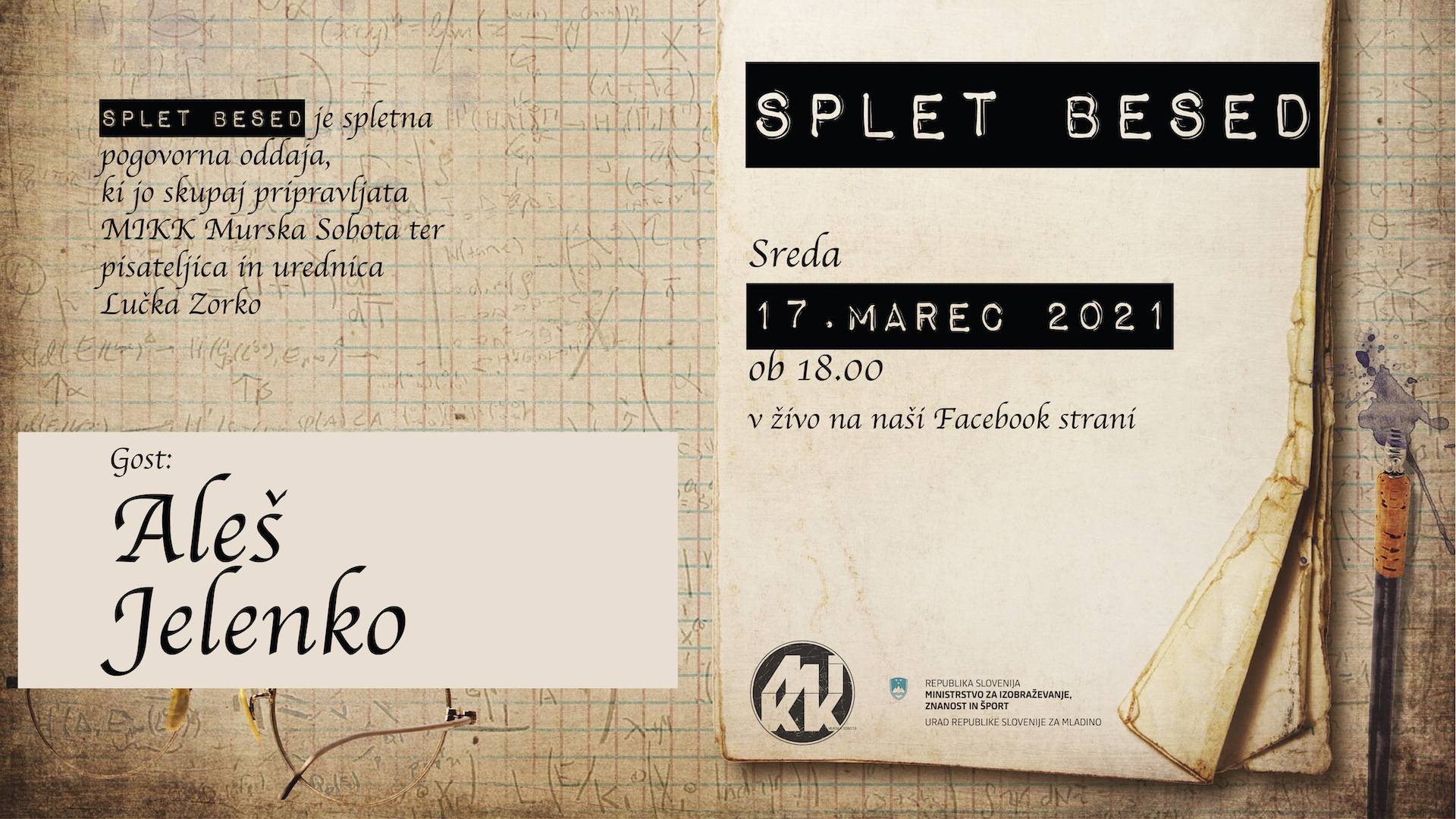 MIKK Murska Sobota Sreda, 17. marec 2021 ob 18h V živo na naši Facebook strani ________ 📚Splet besed je spletna pogovorna oddaja, ki jo skupaj pripravljata MIKK ...