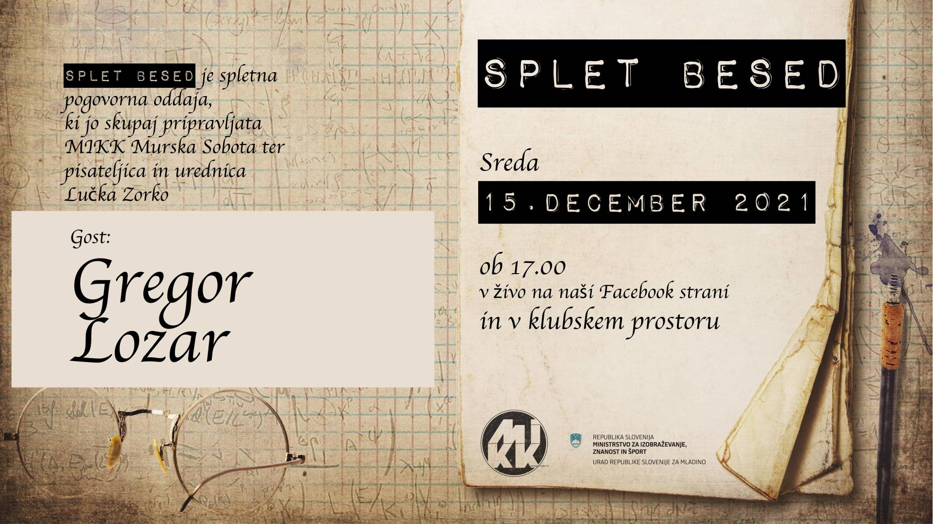 📚Splet besed je spletna pogovorna oddaja, ki jo skupaj pripravljata MIKK Murska Sobota ter pisateljica in urednica Lučka Zorko. V oddaji, ki bo potekala vsako drugo sredo ob 18. uri, bomo spregovorili širše o književnosti.