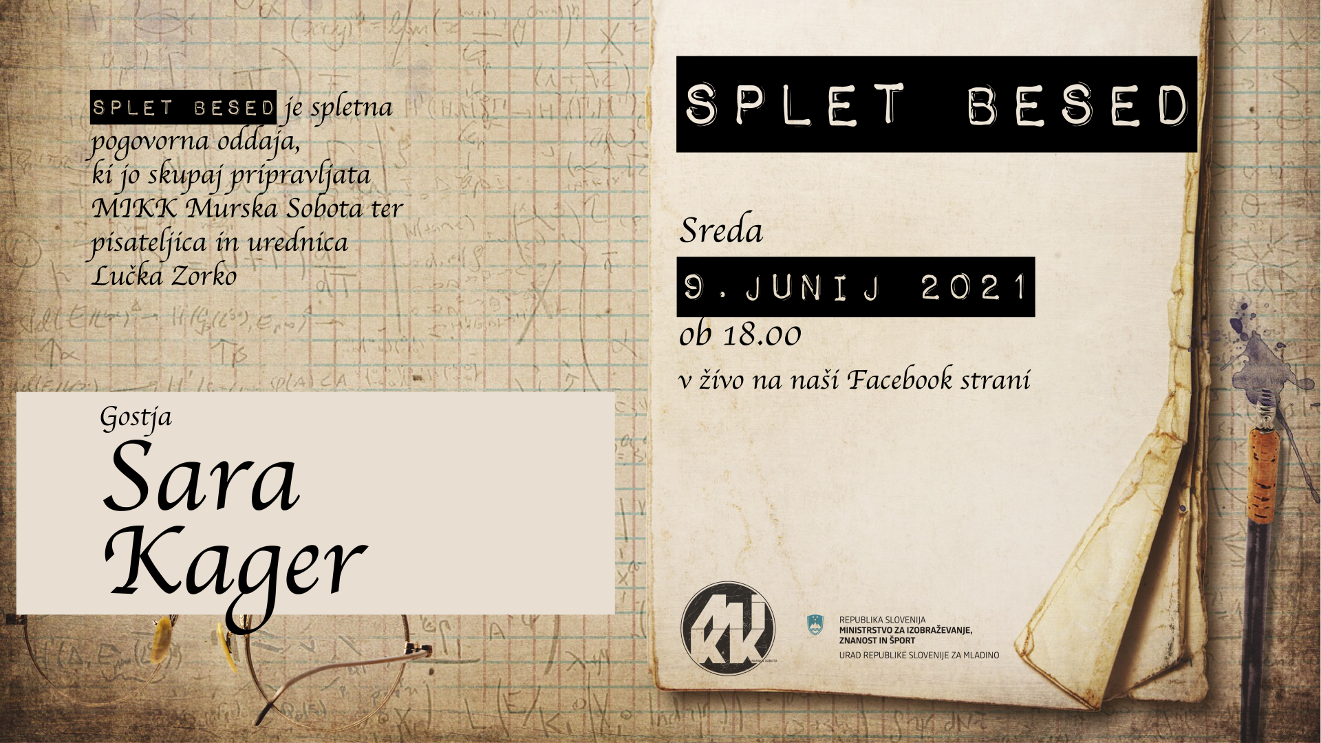 📚Splet besed je spletna pogovorna oddaja, ki jo skupaj pripravljata MIKK Murska Sobota ter pisateljica in urednica Lučka Zorko. V oddaji, ki bo potekala vsako drugo sredo ob 18. uri, bomo spregovorili širše o književnosti.