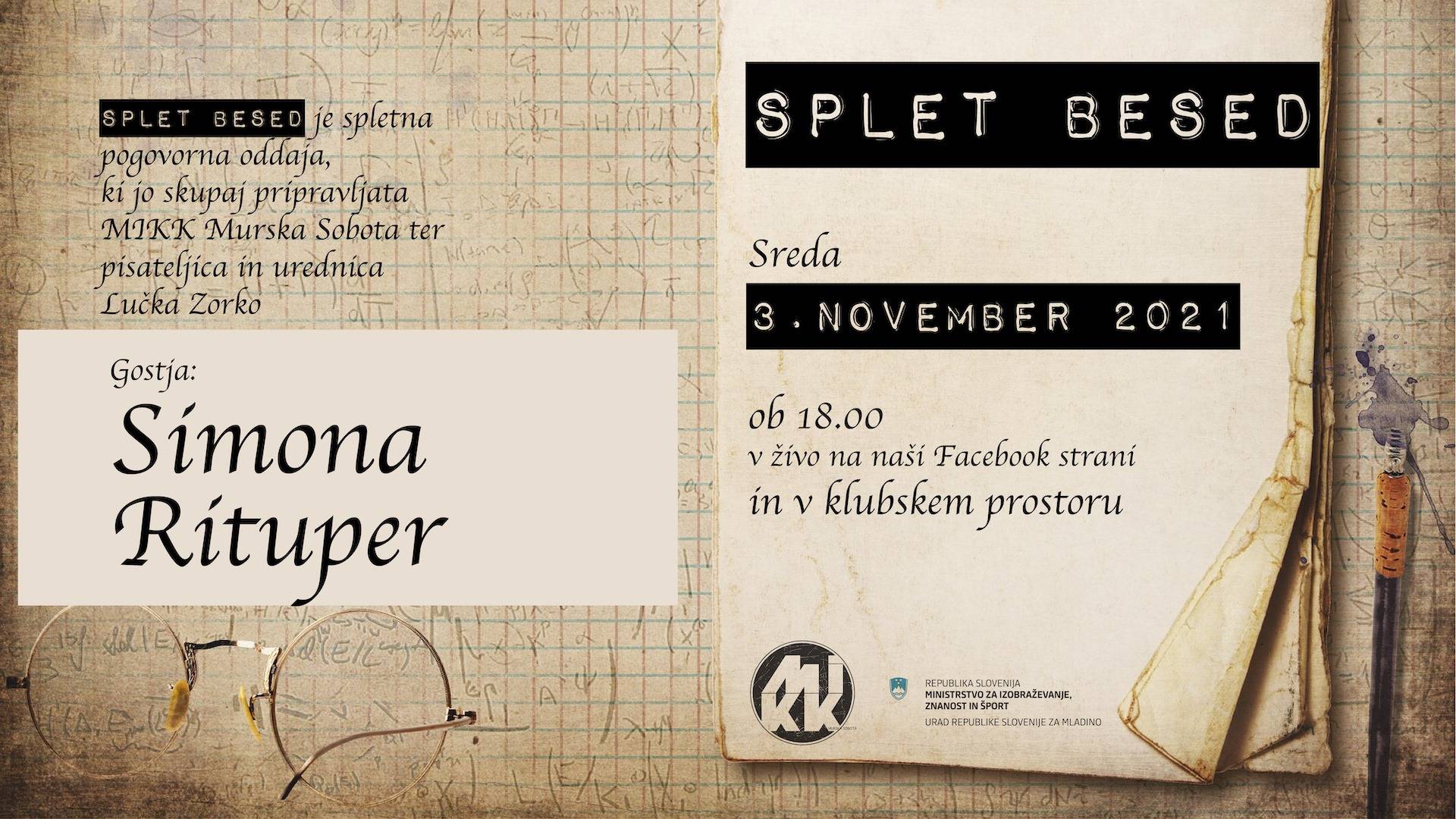 📚Splet besed je spletna pogovorna oddaja, ki jo skupaj pripravljata MIKK Murska Sobota ter pisateljica in urednica Lučka Zorko. V oddaji, ki bo potekala vsako drugo sredo ob 18. uri, bomo spregovorili širše o književnosti.