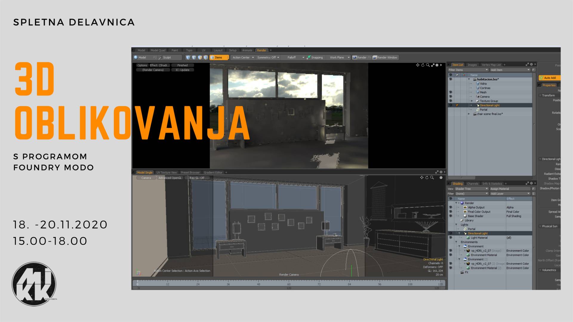 18. - 20.11.2020 15.00 - 18.00 _________________ Delavnica iz 3D oblikovanja s programskim orodjem Foundry Modo je namenjena vsem posameznikom, dijakom in ...