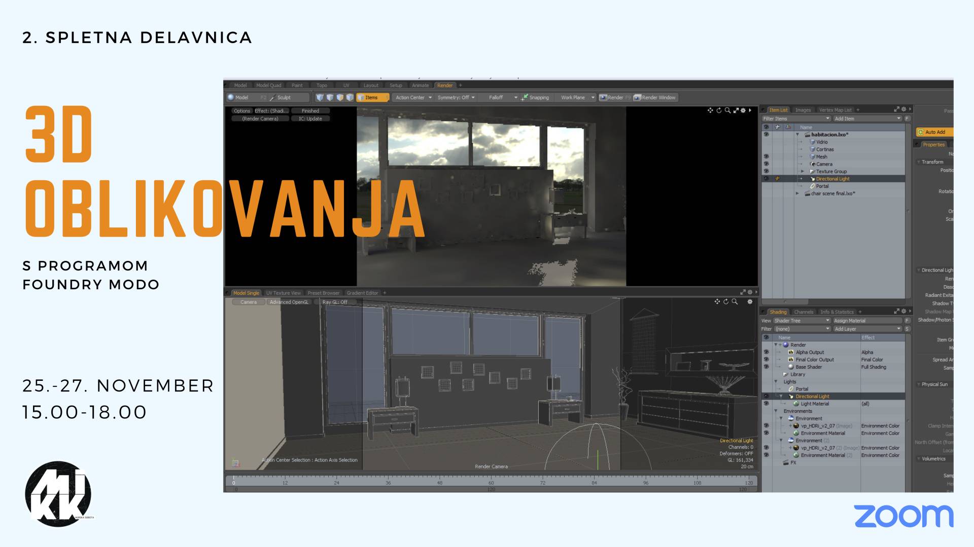 Delavnica iz 3D oblikovanja s programskim orodjem Foundry Modo je namenjena vsem posameznikom, dijakom in študentom, ki se zanimate za arhitekturo, grafično oblikovanje in ostale umetniško-strokovne smeri. Na trodnevni delavnici se boste spoznali z osnovnimi funkcijami programa, se naučili 3D modeliranja, senčenja modelov, dodajanja materijalov ter uporabljanje mnogih učinkov (odsev, sence, atmosferski vpliv,…)