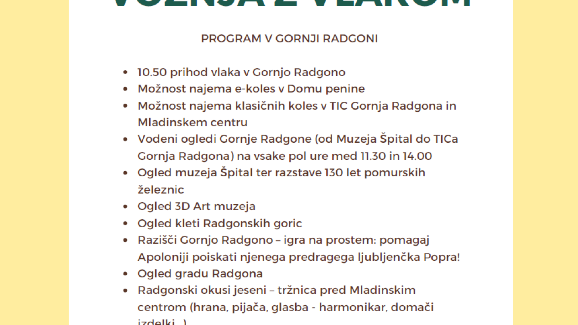 Ob tej priložnosti smo v Gornji Radgoni pripravili tudi pester program, ki si ga lahko preberete na tej povezavi https://www.kultprotur.si/sl/novice/spominska-voznja-z-vlakom-program-v….