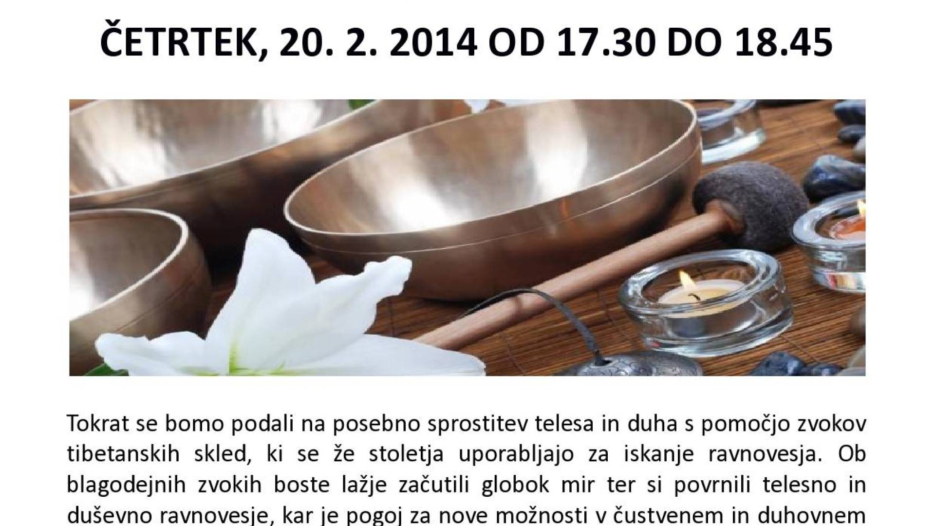 Sofija LendavaTokrat se bomo podali na posebno sprostitev telesa in duha s pomočjo zvokov tibetanskih skled, ki se že stoletja uporabljajo za iskanje ravnovesja. Ob blagodejnih zvokih boste lažje začutili globok mir ter si povrnili telesno in duševno ravnovesje, kar je pogoj za nove možnosti v čustvenem in duhovnem življenju. Med sproščanjem samo ležite in se prepuščate zvokom. Na koncu pa se bomo predali sporočilom angelskih kart, ki v naše življenje prinašajo božansko čarobnost. Cena je 6€ oz. velja mesečna karta za jogo.