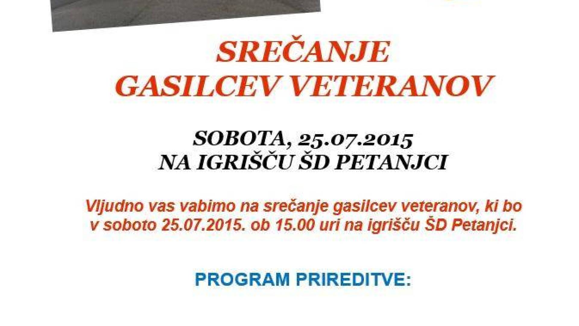 PetanjciVljudno vas vabimo na srečanje gasilcev veteranov POMURJA, ki bo v soboto 25.07.2015 ob 15:00 uri na igrišču ŠD Petanjci. Zabaval vas bo ansambel Opoj. Za hrano in pijačo poskrbljeno.