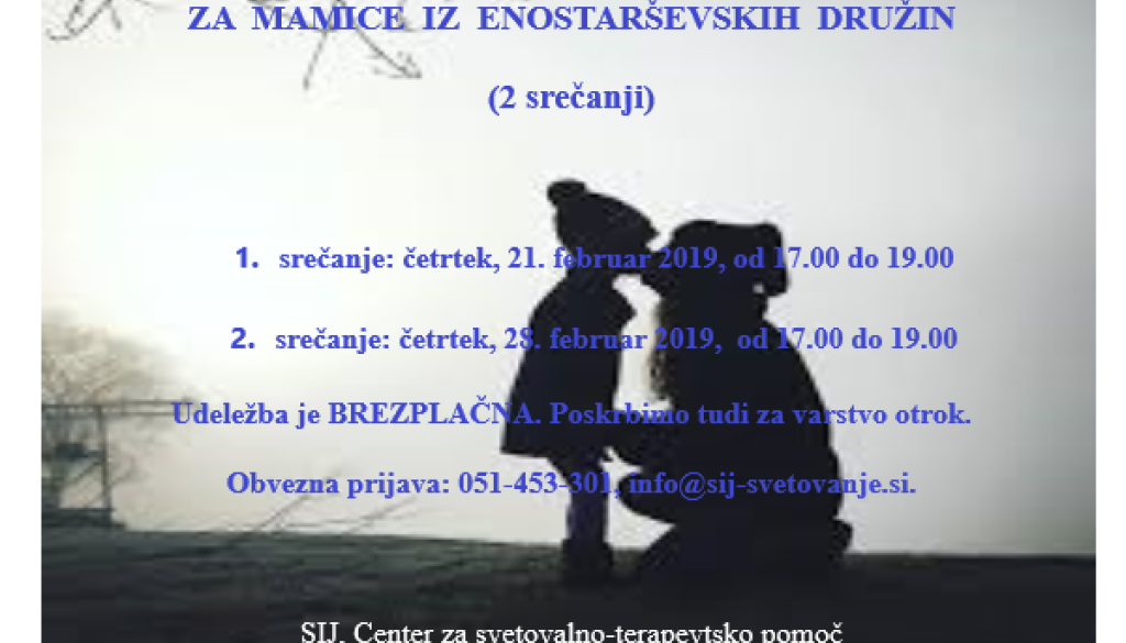 SIJ, Center za svetovalno-terapevtsko pomoč, Ulica Štefana Kovača 3, BeltinciLočitev, razpad zveze, smrt partnerja ali morda zavestna odločitev za samostojno vzgajanje otrok prinaša veliko sprememb in prilagajanja, sproža nove emocije in ranljive trenutke, tako pri materi kot pri njenih otrocih. Na srečanju se bomo pogovarjale o tem, kako se samske matere spopadajo z ovirami, ki so jim postavljene na pot. Dotaknile se bomo težav in stisk mamic, odnosa med mamo in otrokom, odnosa z drugimi, prednosti in slabosti materinskih enostarševskih družin …