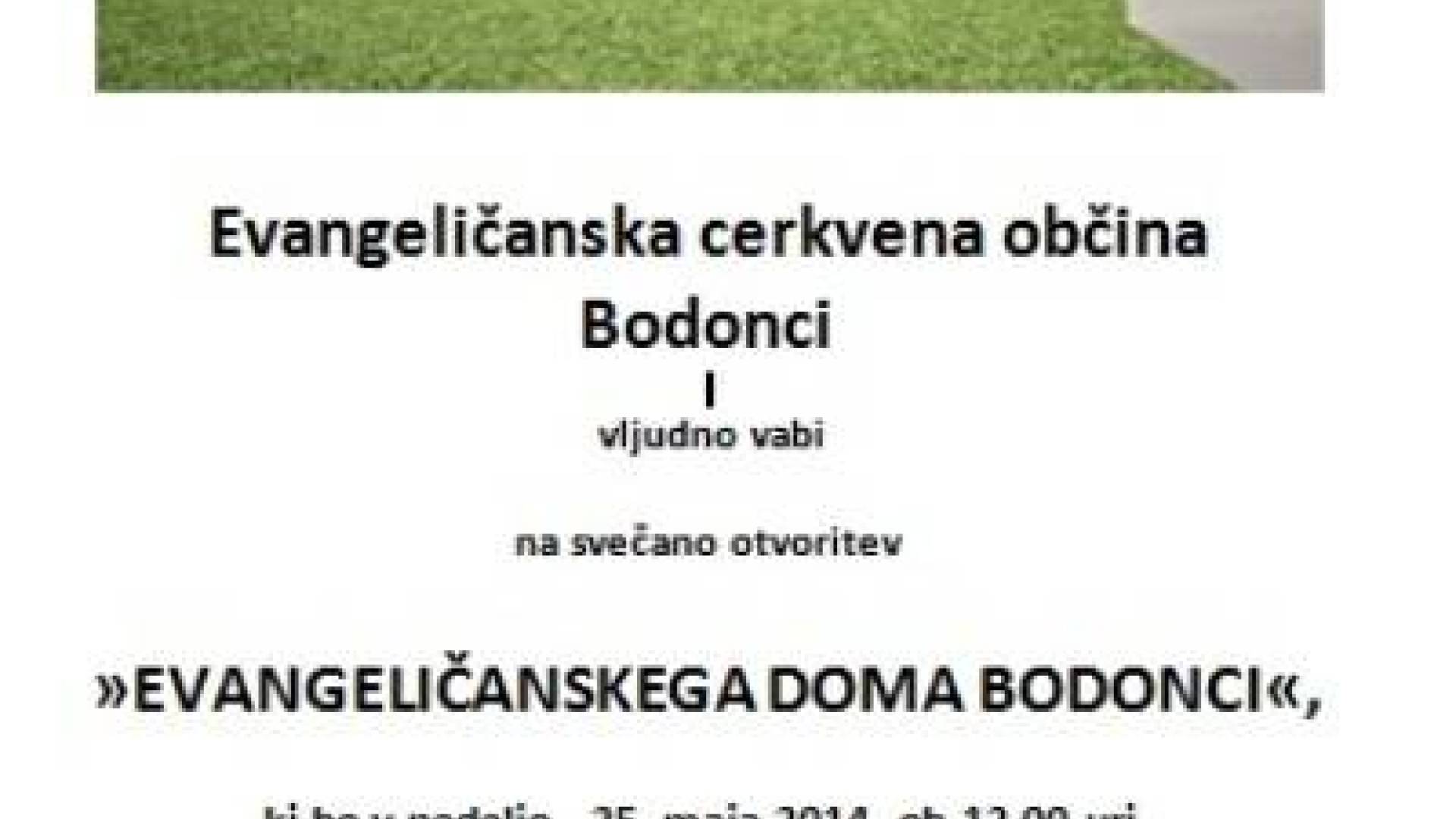 Evangeličanski dom BodonciEvangeličanska cerkvena občina Bodonci vljudno vabi na svečano otvoritev »EVANGELIČANSKEGA DOMA BODONCI«,