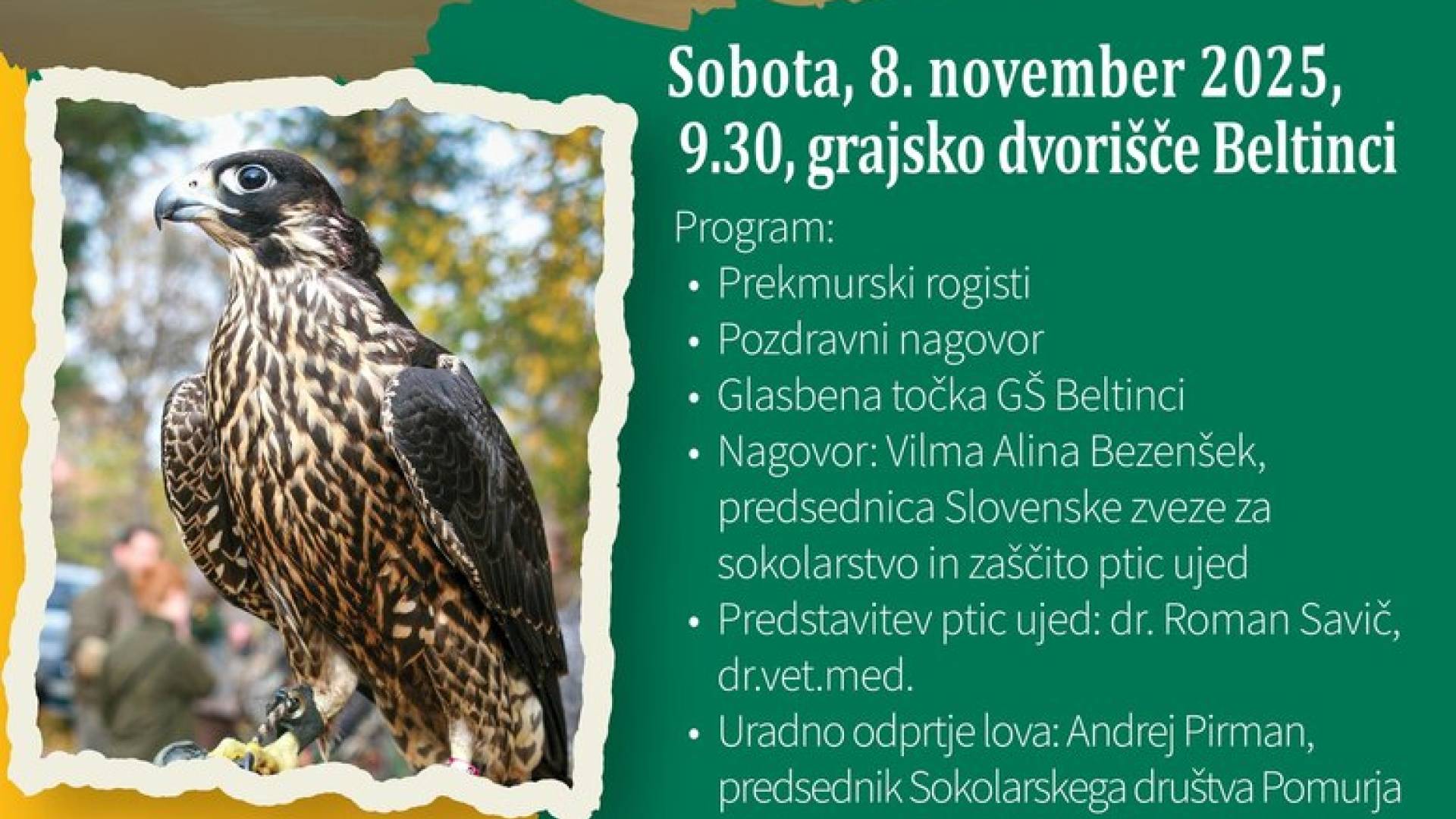 SVEČANO ODPRTJE LOVA S SOKOLI V POMURJU gregor1 | 20. oktober 2025 08:32 v Ostalo Termin Sobota, 8. november 2025 9:30 Lokacija Grad Beltinci SVEČANO ODPRTJE LOVA S SOKOLI V POMURJU
