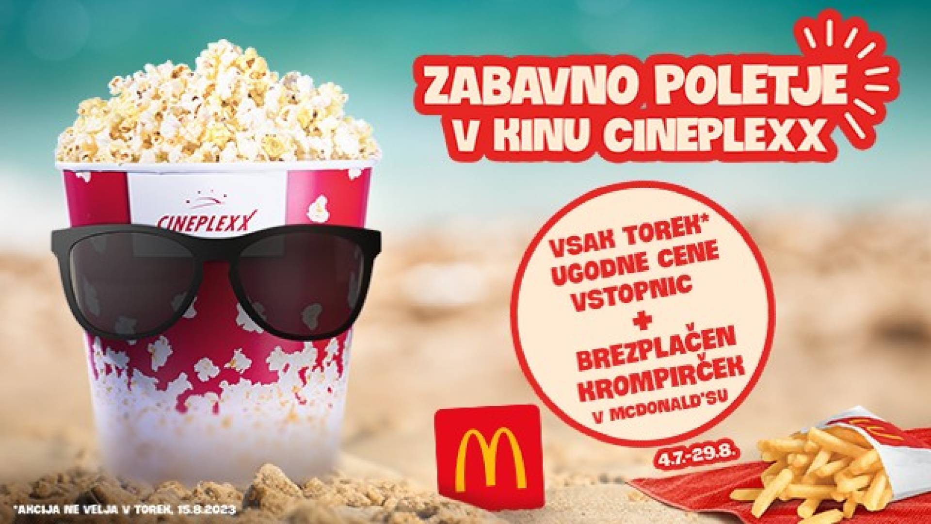 Kupon za brezplačen mali krompirček v McDonaldsu prejmeš ob nakupu kino vstopnice v kinih Cineplexx, ob torkih*, v obdobju od 4. julija do 29. avgusta 2023.