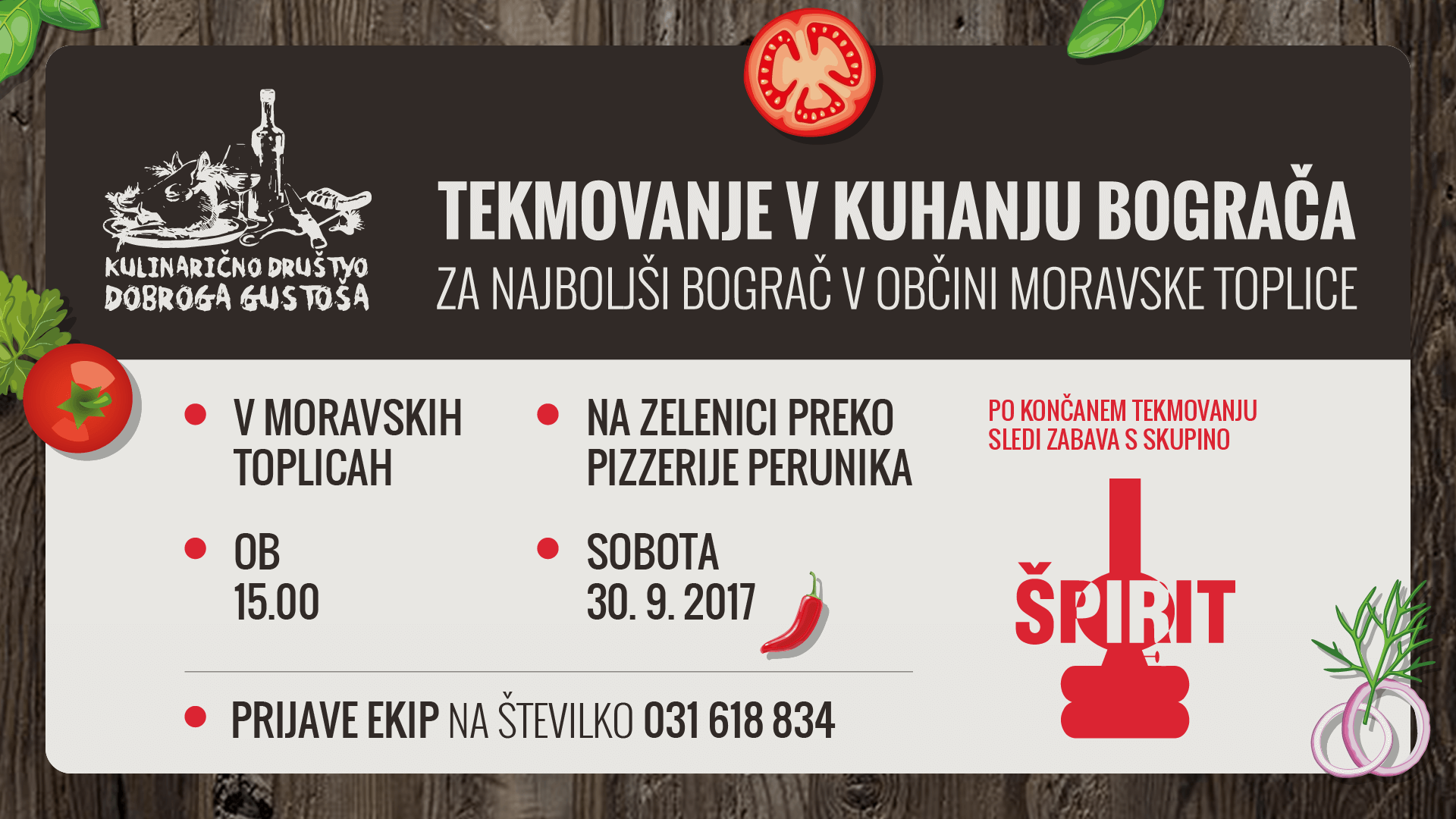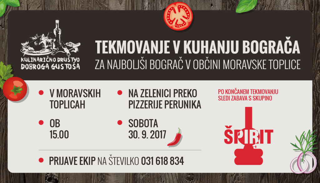 Moravske Toplice, zelenica preko Pizzerije PerunikaKulinarično društvo dobroga gustoša vas vabi, da se preizkusite v kuhanju bograča, ki ga bodo organizirali v sklopu zaključne zabave kulinarične tržnice na zelenici preko Pizzerije Perunika. Z najboljšim bogračem se boste potegovali za PLAKETO IN POKAL NAJBOLJŠI BOGRAČ V OBČINI MORAVSKE TOPLICE.