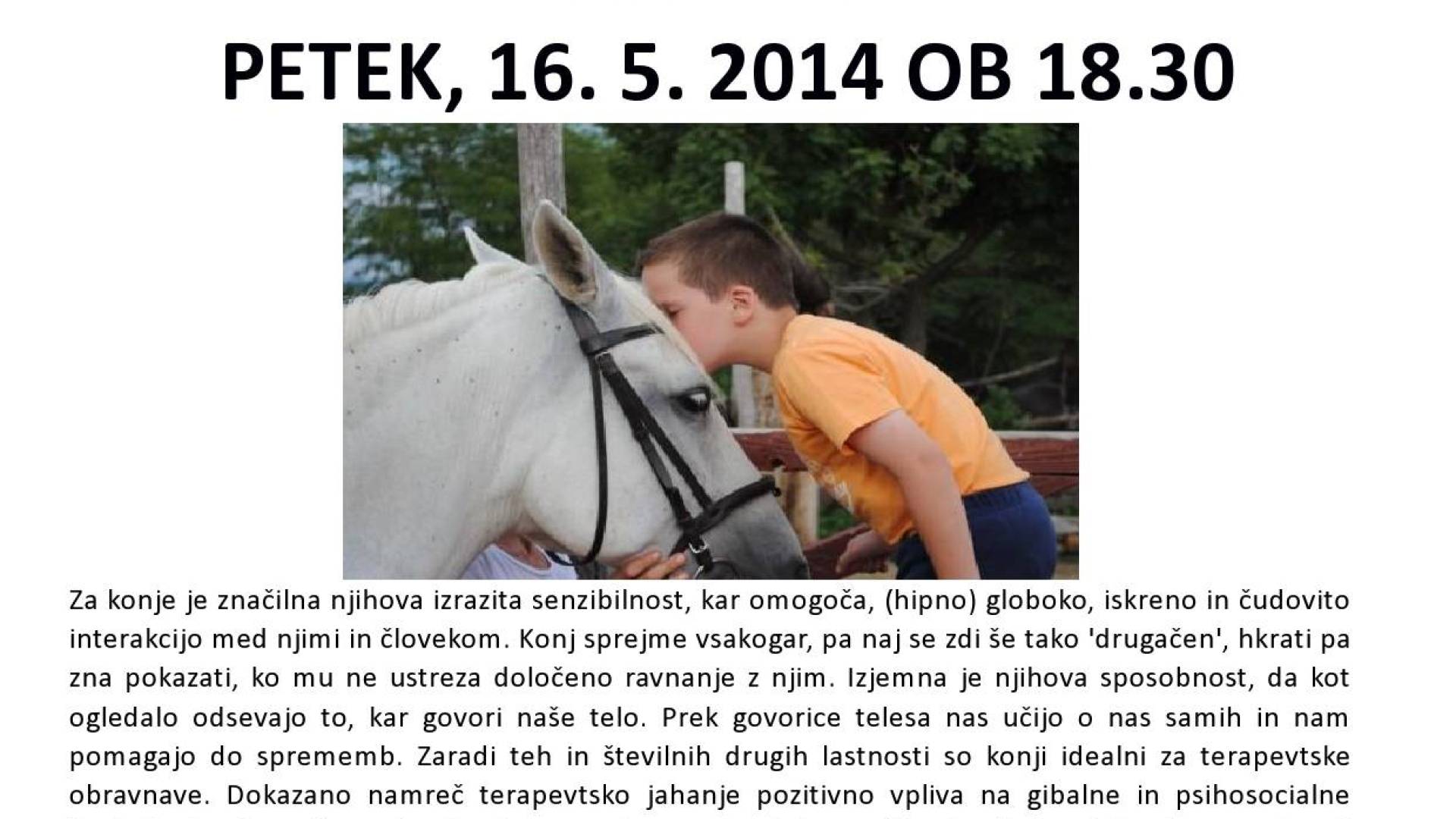 Sofija LendavaZa konje je značilna njihova izrazita senzibilnost, kar omogoča, (hipno) globoko, iskreno in čudovito interakcijo med njimi in človekom. Konj sprejme vsakogar, pa naj se zdi še tako 'drugačen', hkrati pa zna pokazati, ko mu ne ustreza določeno ravnanje z njim. Izjemna je njihova sposobnost, da kot ogledalo odsevajo to, kar govori naše telo. Prek govorice telesa nas učijo o nas samih in nam pomagajo do sprememb. Zaradi teh in številnih drugih lastnosti so konji idealni za terapevtske obravnave. Dokazano namreč terapevtsko jahanje pozitivno vpliva na gibalne in psihosocialne funkcije in dinamično zdravljenje, usmerjeno na celotnega človeka (telo, duha in sposobnost vzpostavljanja odnosov).