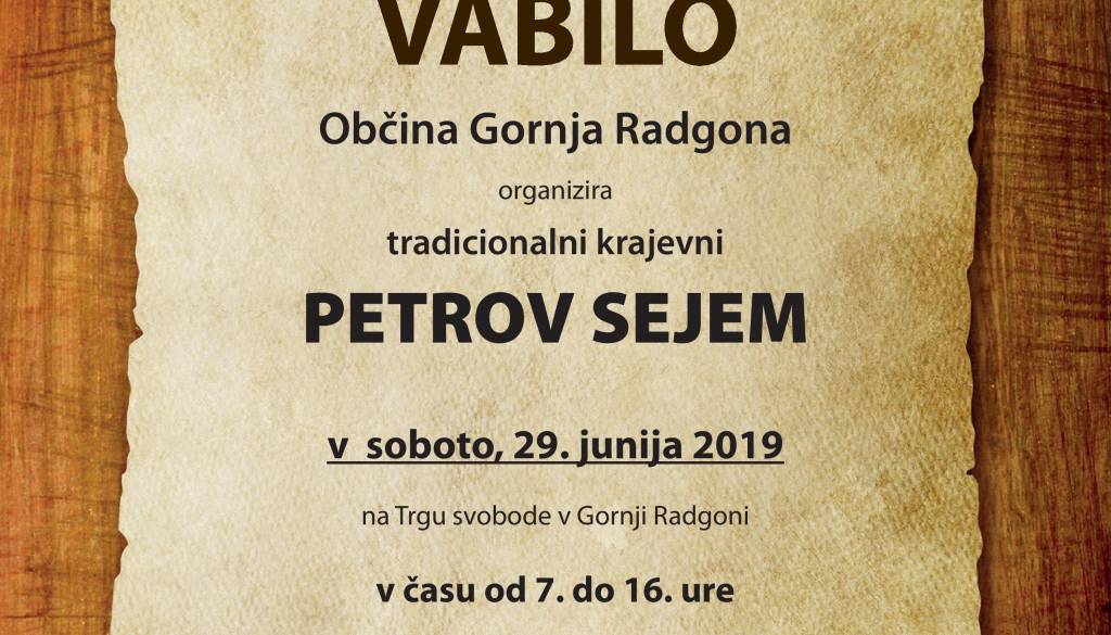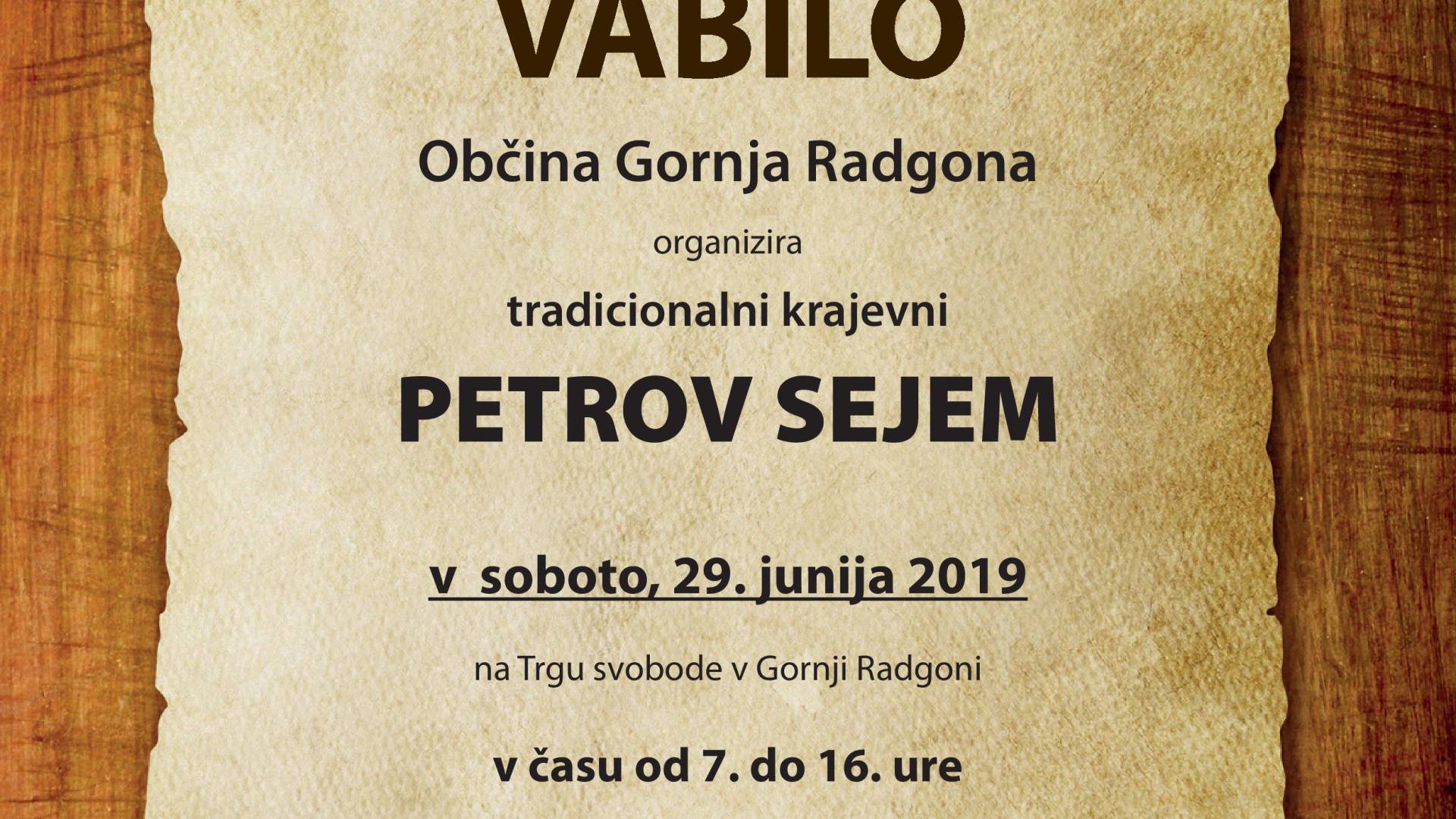 Petrov sejem, povezan s farnim patronom župnije Gornja Radgona – sv. Petrom, je vsakoletna tradicionalna prireditev. Tudi to leto se bo na Trgu svobode odvijal 29. junija, med 7. in 16. uro. Prijazno vabljeni! Na stojnicah najdemo pestro ponudbo domače in umetnostne obrti, degustacije kmečkih dobrot, kulinarično in vinsko ponudbo ter predstavitev raznih društev in zavodov iz Gornje Radgone in okolice.