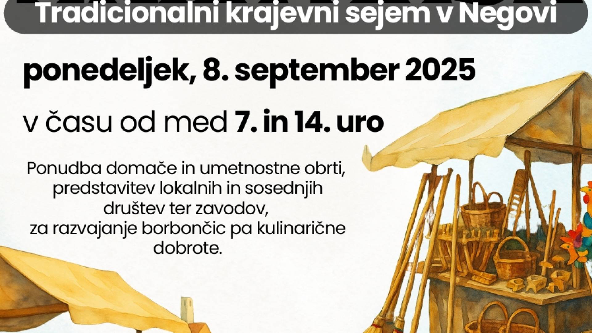 NegovaV ponedeljek, 8. septembra 2025, med 7. in 14. uro, vas vabimo v Negovo na Tradicionalni krajevni sejem Mala maša v Negovi.