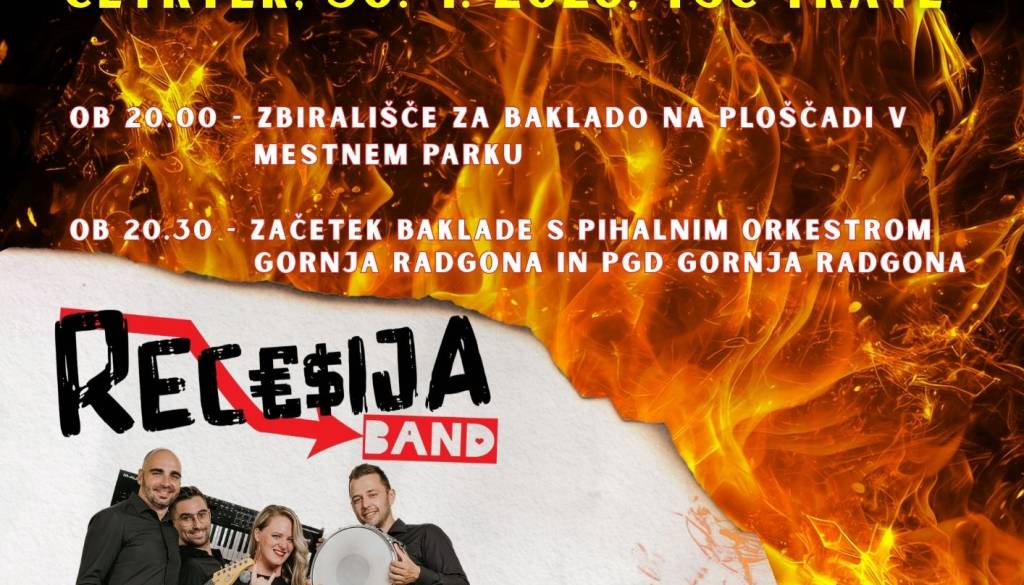 Ob 20. 30 bomo v spremstvu Pihalnega orkestra Gornja Radgona in PGD Gornja Radgona s prižganimi baklami odkorakali na TŠC Trate, kjer bodo za dobro vzdušje, zraven kulinarične ponudbe, poskrbeli tudi glasbeniki. Letos nas bodo dolgo v noč zabavali 𝗥𝗘𝗖𝗘𝗦𝗜𝗝𝗔 𝗕𝗔𝗡𝗗!