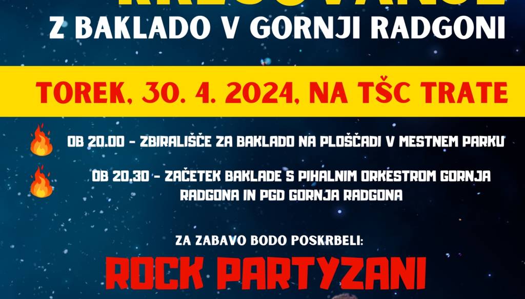 Ob 20. 30 bomo v spremstvu Pihalnega orkestra Gornja Radgona in PGD Gornja Radgona s prižganimi baklami odkorakali na TŠC Trate, kjer bodo za dobro vzdušje, zraven kulinarične ponudbe, poskrbeli tudi glasbeniki. Letos nas bodo dolgo v noč zabavali z ROCK PARTYZANI!