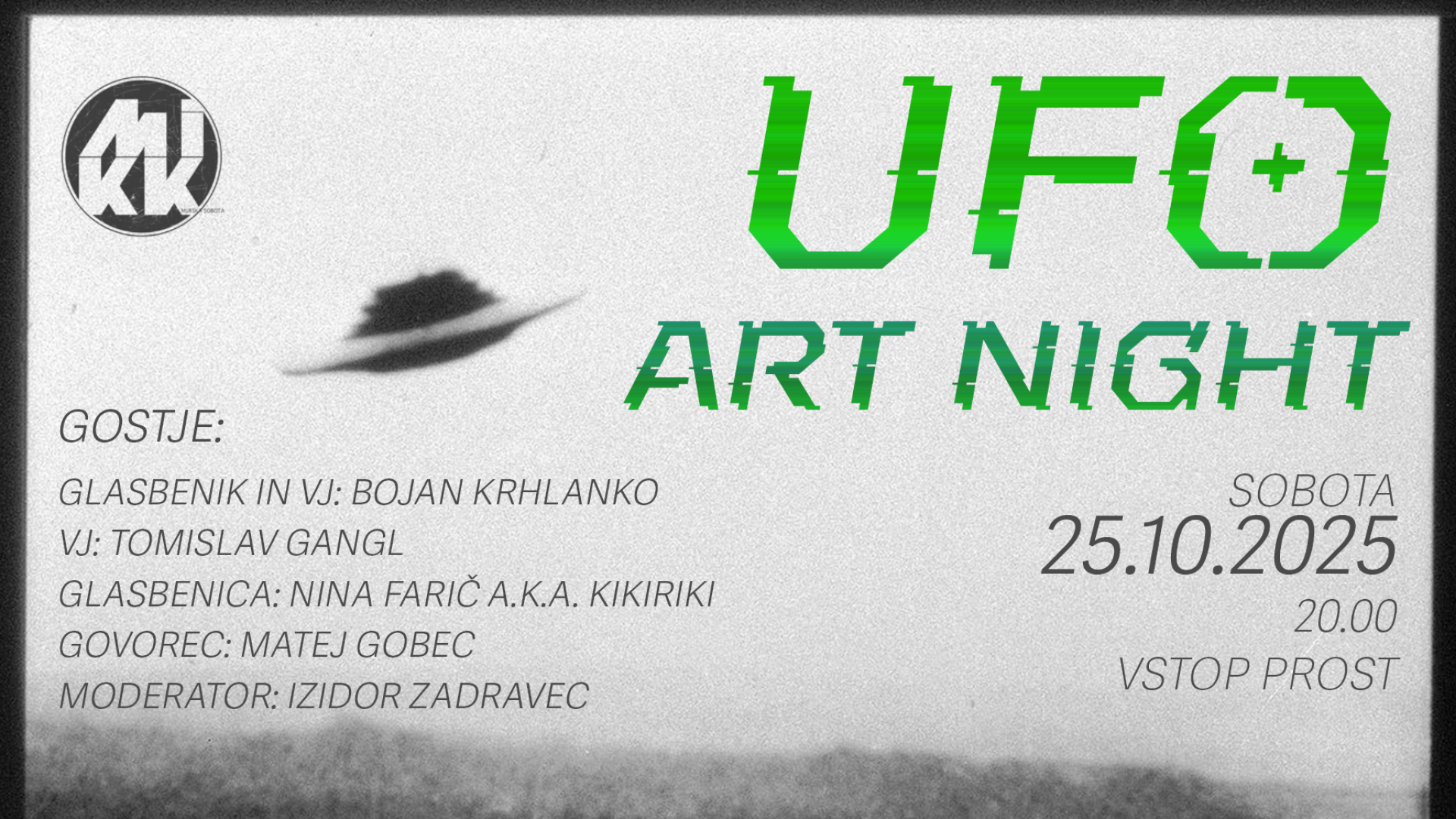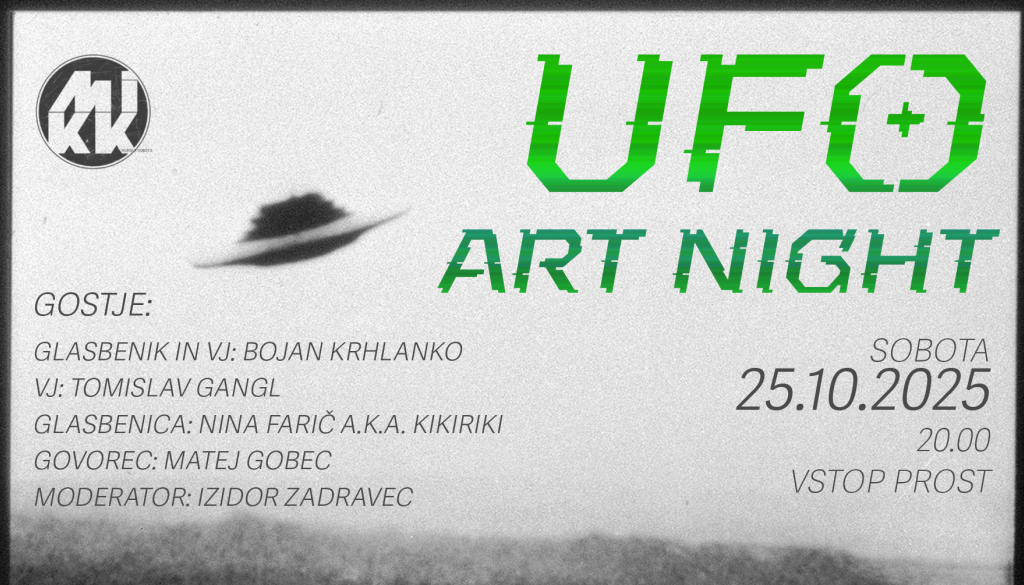 𝙋𝙧𝙤𝙟𝙚𝙠𝙩 𝙐𝙁𝙊 𝘼𝙧𝙩 𝙉𝙞𝙜𝙝𝙩 je prvi tovrstni dogodek v Sloveniji – interdisciplinarni umetniški večer, ki združuje vizualne projekcije (VJ-ing), glasbo v živo ter moderirano razpravo.