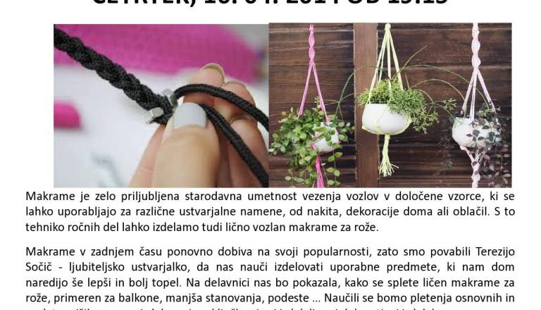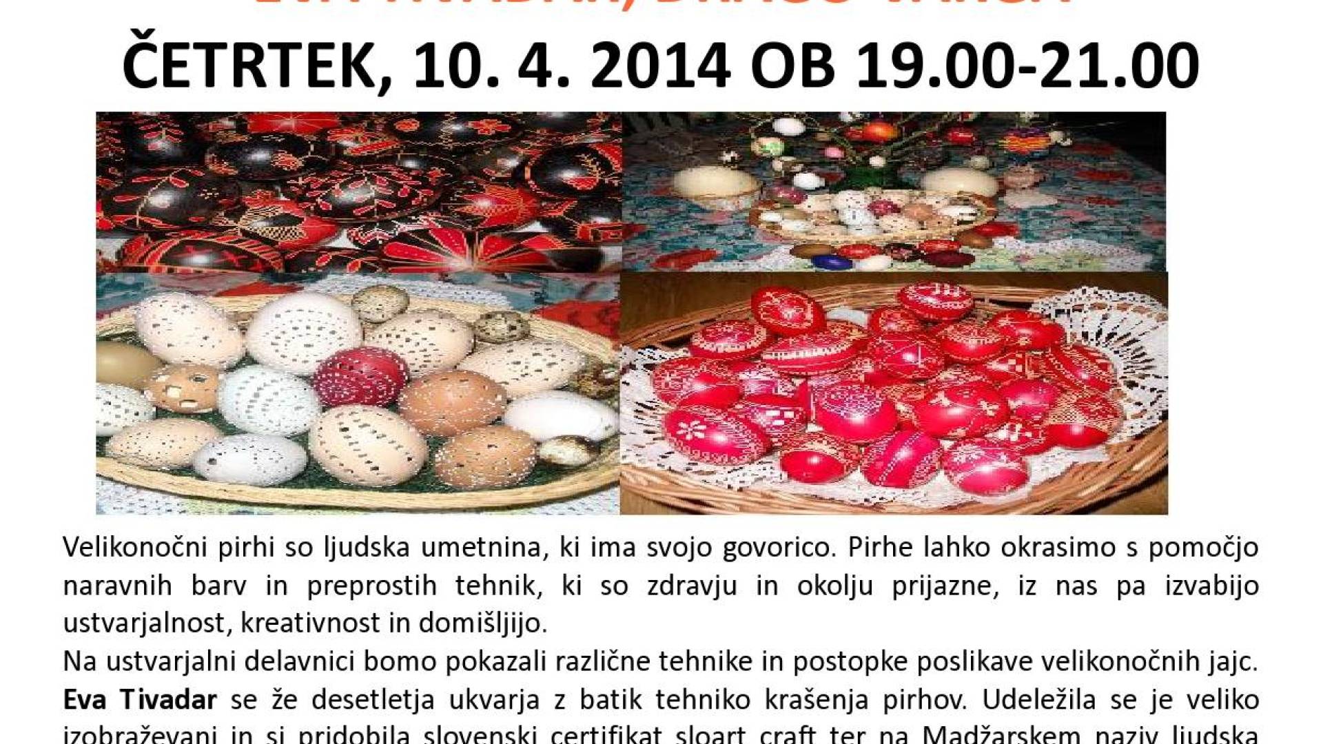 Na ustvarjalni delavnici bomo pokazali različne tehnike in postopke poslikave velikonočnih jajc. Eva Tivadar se že desetletja ukvarja z batik tehniko krašenja pirhov. Udeležila se je veliko izobraževanj in si pridobila slovenski certifikat sloart craft ter na Madžarskem naziv ljudska umetnica domače obrti. Drago Varga se ljubiteljsko ukvarja s poslikavo velikonočnih pirhov in nam bo predstavil precizno tehniko vrtanja luknjic s svedri in nekatere prav tako izvirne.  Pridružite se nam na delavnici, prepustite se svoji domišljiji in ustvarite svoj unikaten izdelek. Cena delavnice je 3 € za materialne stroške. Svoje izdelke boste odnesli domov.