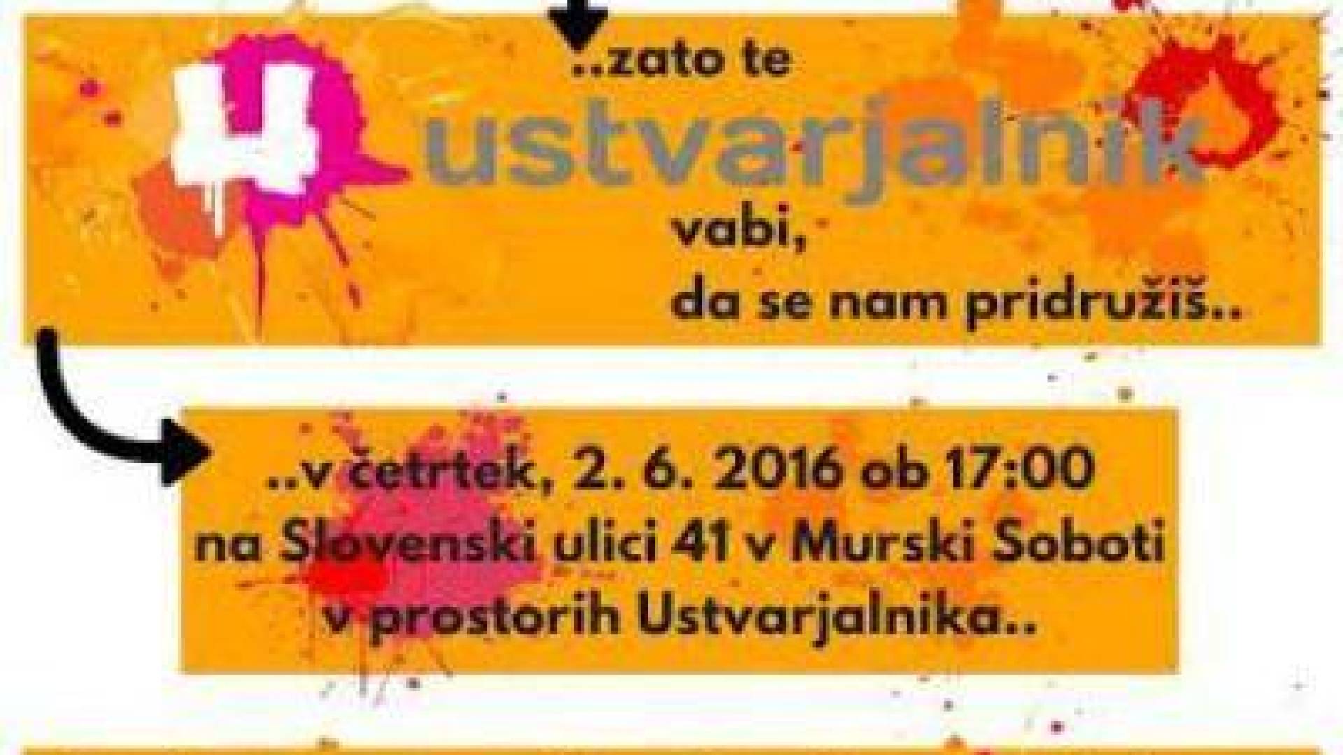 Mladim želijo predvsem vliti zaupanje in nuditi nova znanja, ki predstavljajo dodano vrednost za njihovo prihodnost. Da bi Ustvarjalnik v Murski Soboti še bolj zaživel, v četrtek, 2. 6. 2016 ob 17:00, pripravljajo Ustvarjalnikov dogodek v prostorih Ustvarjalnika na Slovenski ulici 41 v Murski Soboti.