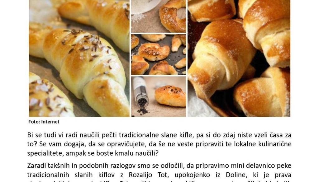 Zaradi takšnih in podobnih razlogov smo se odločili, da pripravimo mini delavnico peke tradicionalnih slanih kiflov z Rozalijo Tot, upokojenko iz Doline, ki je prava strokovnjakinja za peko kiflov. Pripravili bomo slane kifle, po sreceptu naših babic in jih začinili z različnimi dodatki: kumino, sezamom, morsko soljo ...
