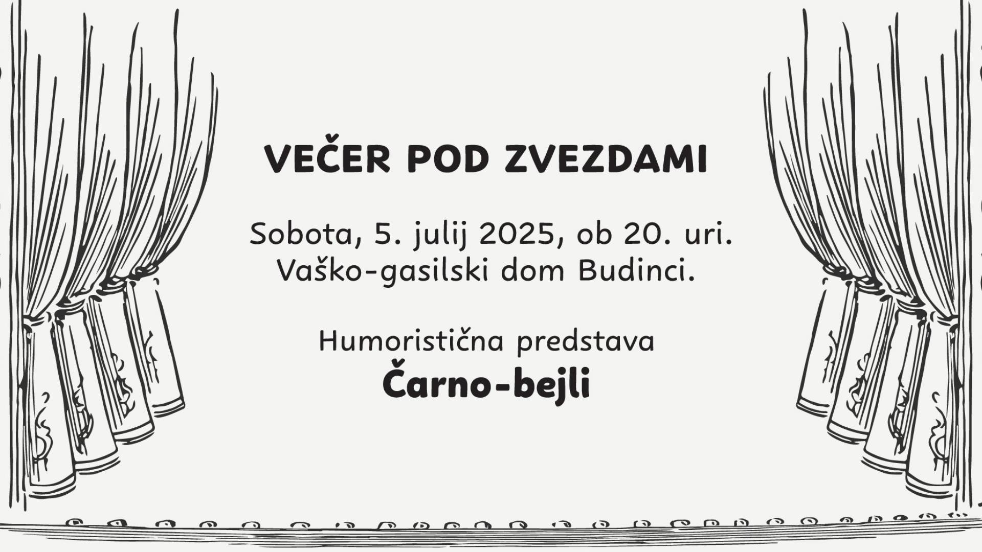 Večer pod zvezdami gregor1 | 2. julij 2025 08:45 v Predstava Termin Sobota, 5. julij 2025 20:00 Lokacija Vaško gasilski dom Budinci Humoristična predstava Čarno-bejli.