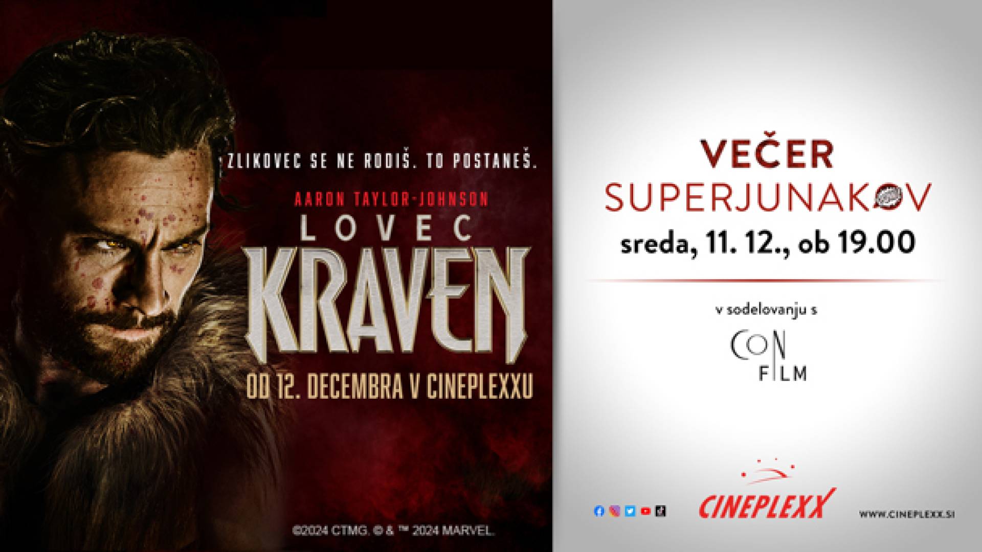 V kinu Cineplexx (Maximus) v Murski SobotiPridruži se nam na Večeru superjunakov s filmom LOVEC KRAVEN, ki bo v sredo, 11. decembra 2024 ob 19:00 v Cineplexxu Murska Sobota!