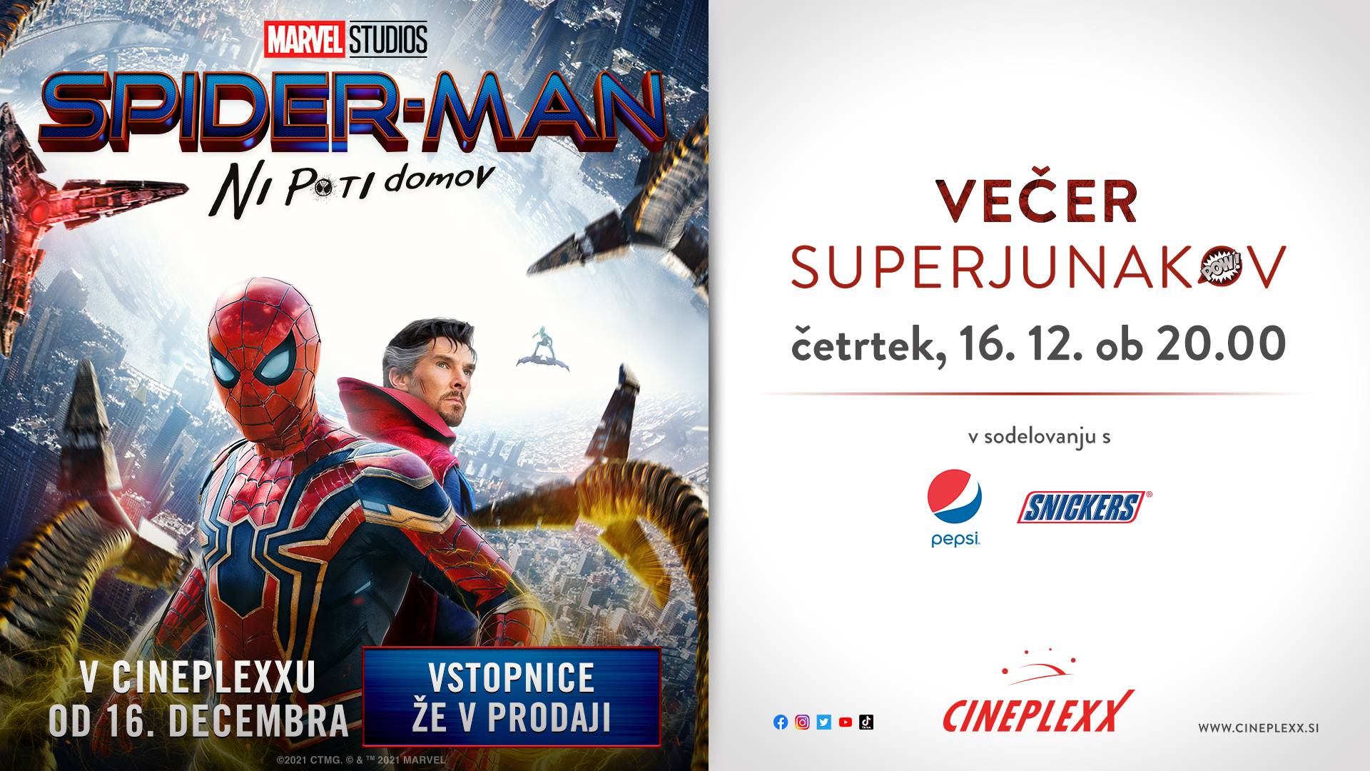 Ne zamudite VEČERA SUPERJUNAKOV s filmom Spider-man: Ni poti domov, ki bo v četrtek, 16. decembra ob 20:00 v Cineplexxu Murska Sobota.