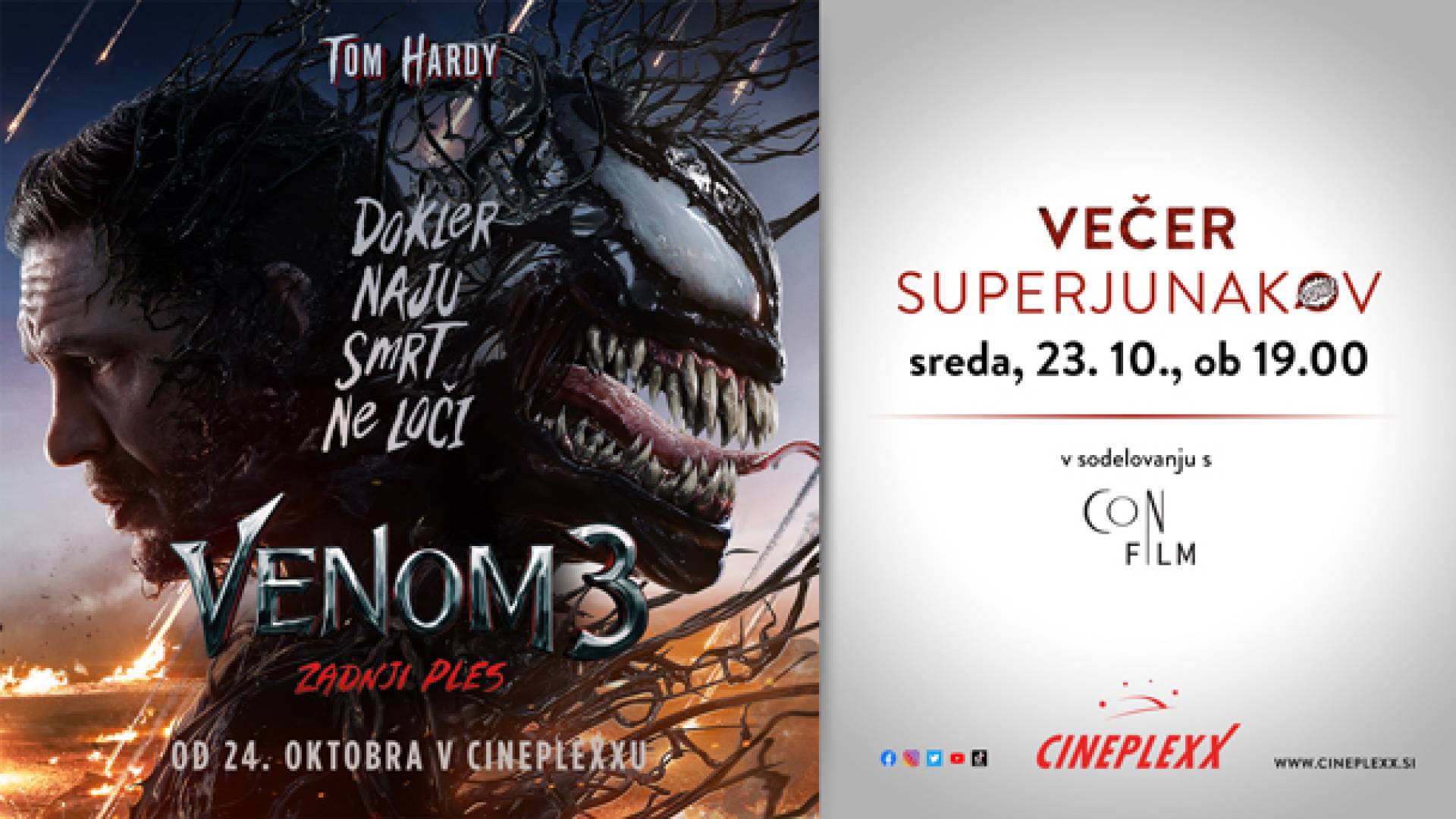 V kinu Cineplexx (Maximus) v Murski SobotiPridruži se nam na Večeru superjunakov s filmom VENOM: ZADNJI PLES, ki bo v sredo, 23. oktobra ob 19:00 v Cineplexxu Murska Sobota!