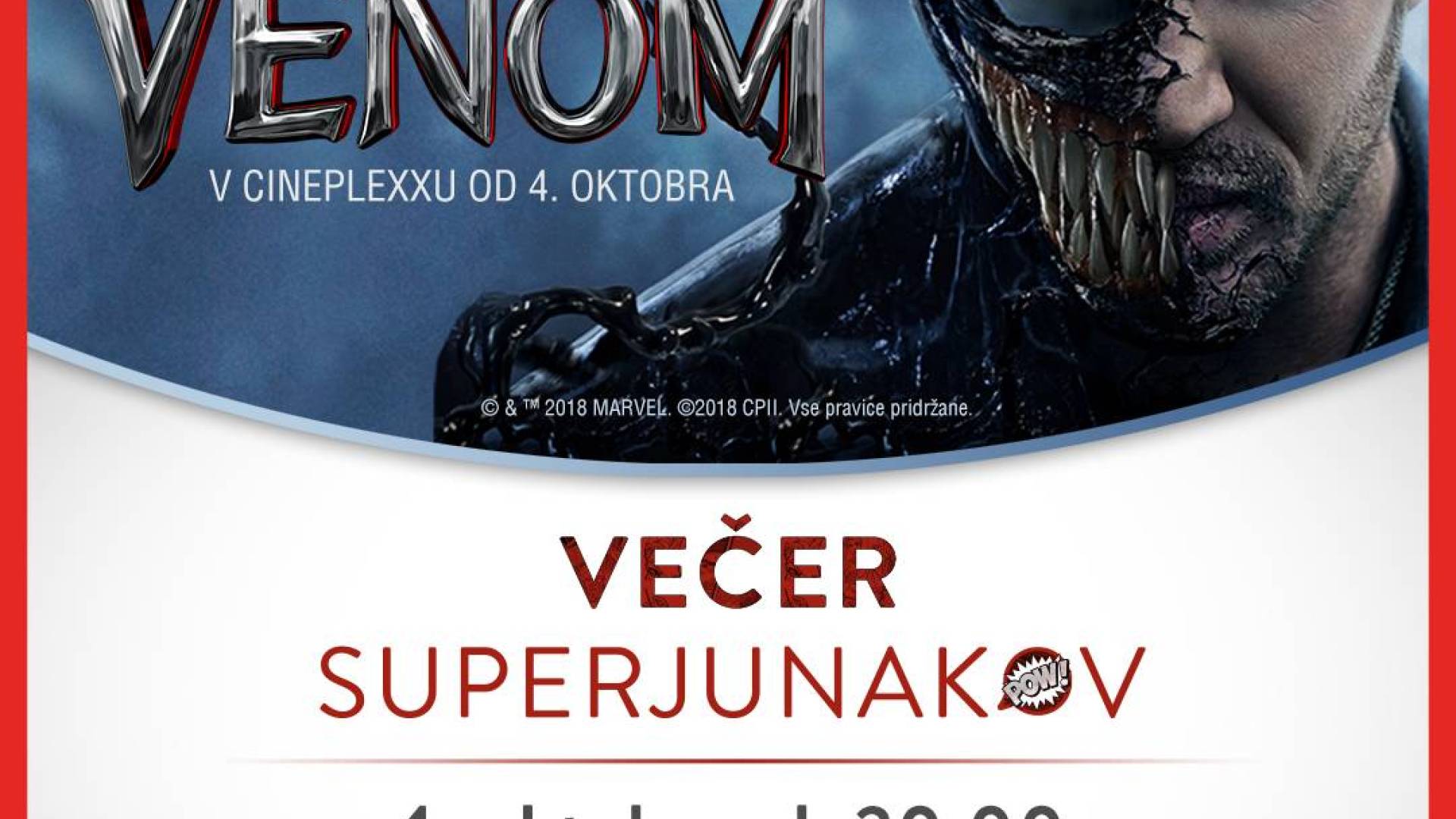 V kinu Cineplexx (Maximus) v Murski SobotiVENOM, najbolj neobičajen protijunak, ki ga že dolgo težko pričakujemo in ga odlično upodobi Tom Hardey, nam bo vlil strah v kosti na Večeru superjunakov, 4. oktobra ob 20:00 v Cineplexxu Murska Sobota. Pohitite z nakupom vstopnice, pod srečnimi sedeži vas čaka tudi omejena izdaja stripa Venom.