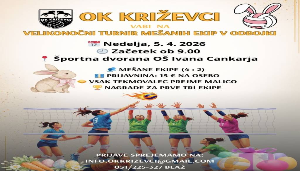 Vabimo vas na tradicionalni velikonočni turnir v dvoranski odbojki, kjer se bomo pomerili v mešanih ekipah (4:2)!