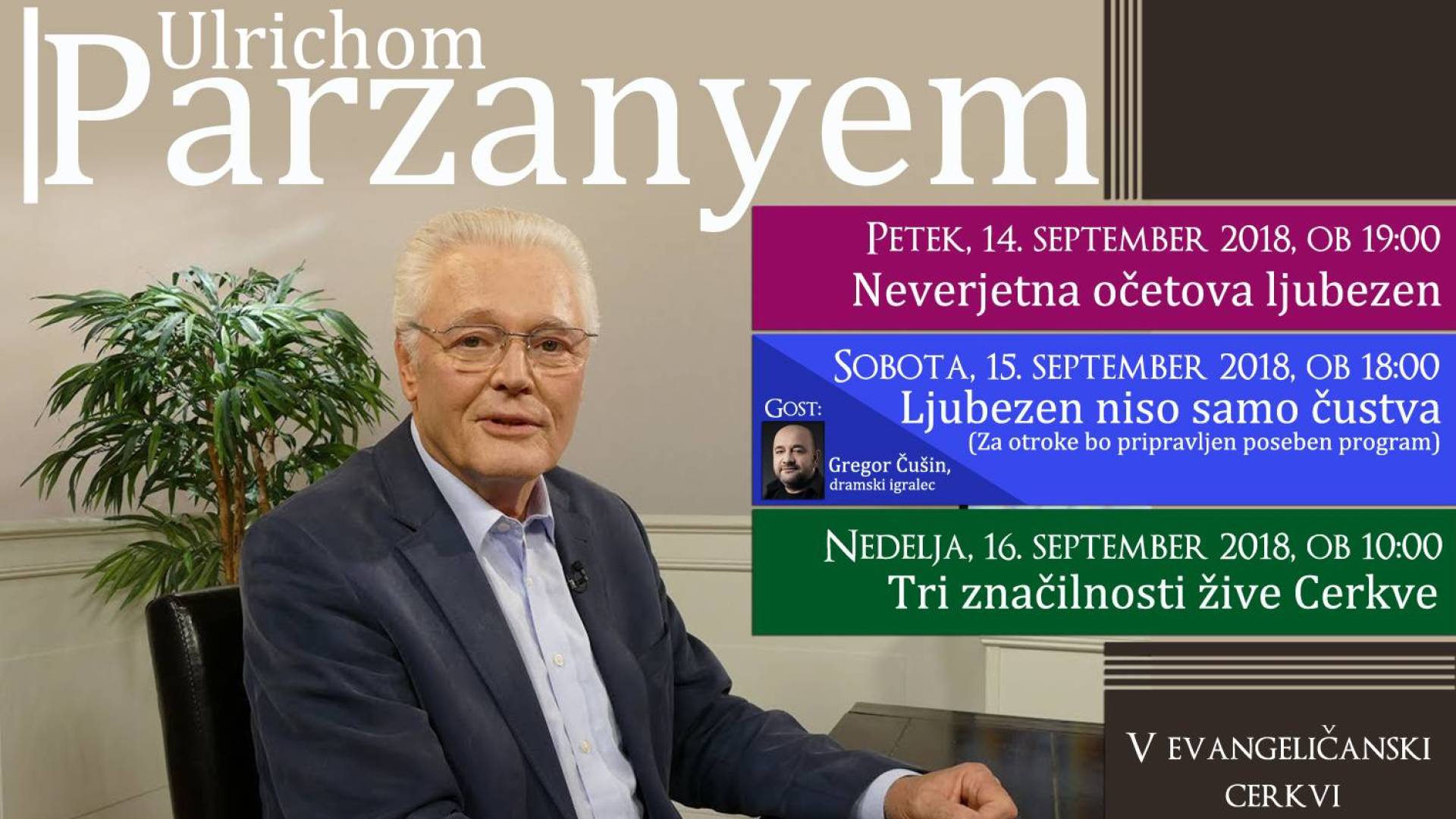 Evangeličanska cerkev Murska SobotaVabimo vas na družinsko popoldne, kjer bo Ulrich Parzany predaval o globokem pomenu ljubezni. Prevod je zagotovljen. Posebni gost večera bo dramski igralec Gregor Čušin. Za otroke je pripravljen zabavni program, ki ga bodo vodili izkušeni animatorji.