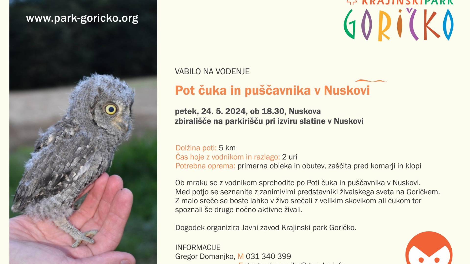Ob mraku se z vodnikom sprehodite po Poti čuka in puščavnika v Nuskovi ter se seznanite z enim od bolj zanimivih živalskih prebivalcev Goričkega. Med potjo se bodo obiskovalci lahko z malo sreče v živo srečali z velikim skovikom ali čukom ter spoznali še druge nočno aktivne živali.