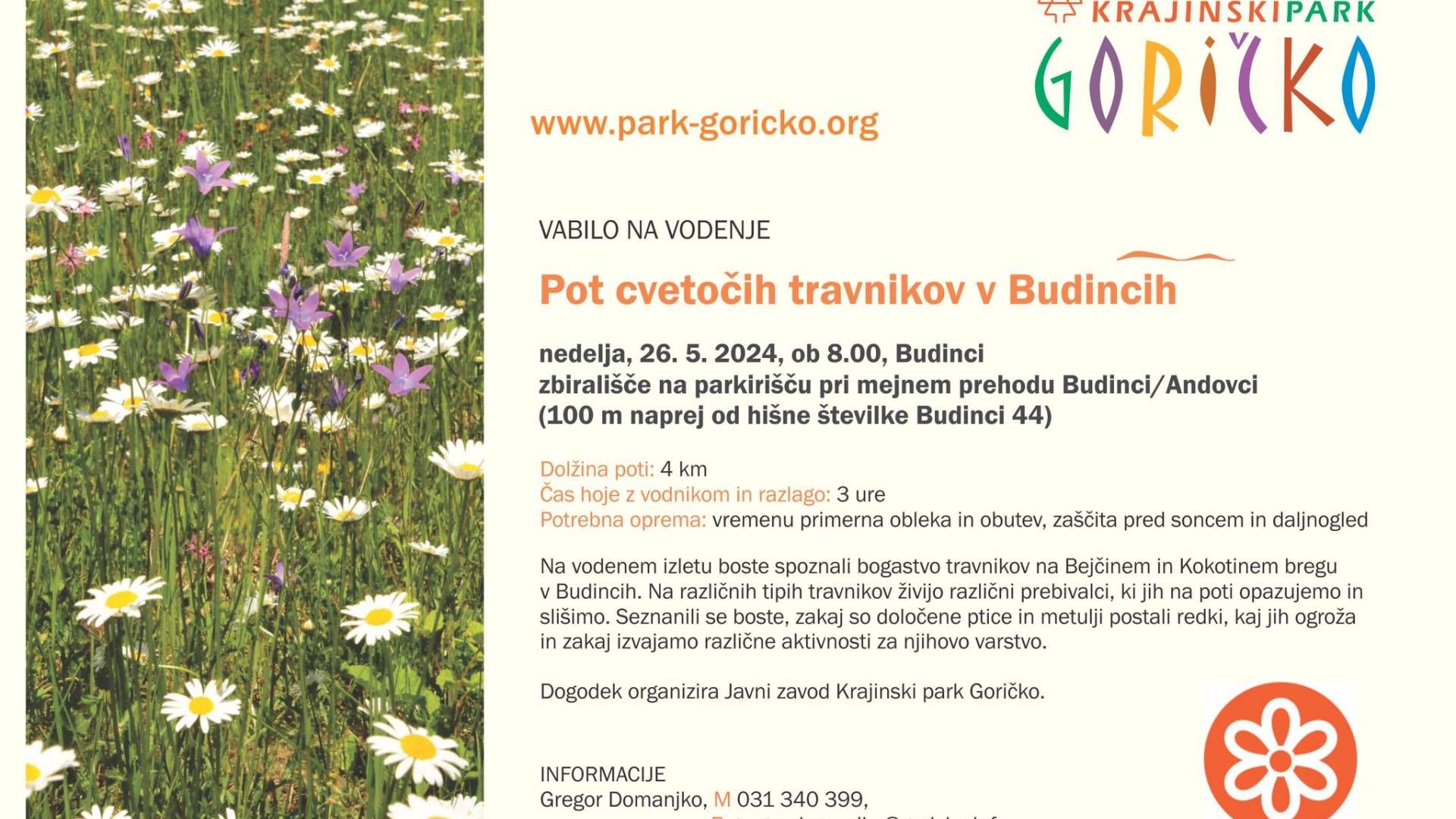 Pot cvetočih travnikov v Budincih obiskovalce popelje med ene od najbolj vrstno pestrih travnikov na Goričkem. Z vodnikom se bodo obiskovalci sprehodili po poti med cvetočimi travniki in spoznali njihovo rastlinsko in živalsko bogastvo ter se seznanili z ukrepi za njihovo ohranitev.