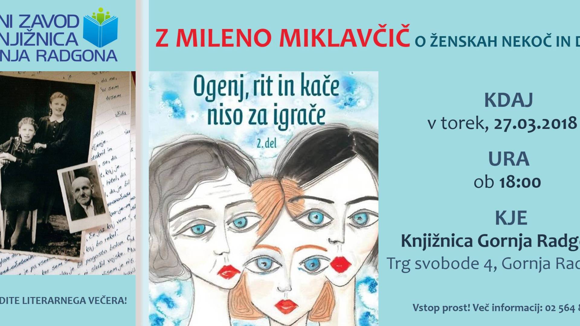 Knjižnica Gornja RadgonaVljudno vabljeni na zanimiv večerni pogovor z Mileno Miklavčič o ženskah nekoč in danes, avtorico dobro branih knjig Ogenj, rit in kače niso za igrače.