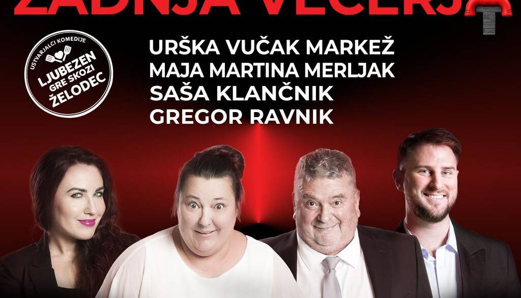 ZADNJA VEČERJA je predstava o dveh čisto običajnih ljudeh, ki se v enem samem popoldnevu znajdeta ujeta v vrtincu nesporazumov, naključij in “dobronamernih” ljudi okoli sebe. To je komedija o lakoti, ljubezni, navadah, kompromisih in trenutkih, ko življenje naroči nekaj povsem drugega, kot bi si mislili. Je polna hitrih dialogov, absurdnih zapletov, hrane, glasbe in presenetljivo nežnih trenutkov. Tako, da se človek resnično vpraša: Kdo sploh vodi moje življenje – jaz ali vsi drugi? Gre za toplo, igrivo in povsem odbito komedijo, kjer se v tempu svetlobne hitrosti menjujejo liki, maske in energije — občinstvo drži v smehu od prve do zadnje replike.