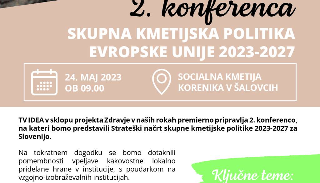 Socialna kmetija Korenika, ŠalovciTV Idea v sklopu projekta Zdravje v naših rokah pripravlja 2. konferenco, na kateri bomo predstavili drugi del Strateškega načrta Skupne kmetijske politike 2023-2027 za Slovenijo.