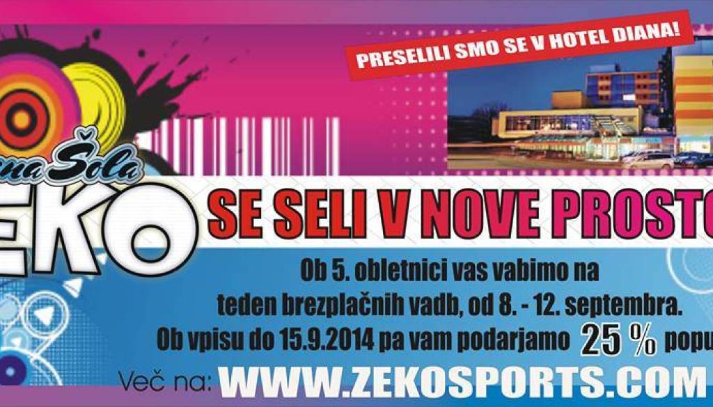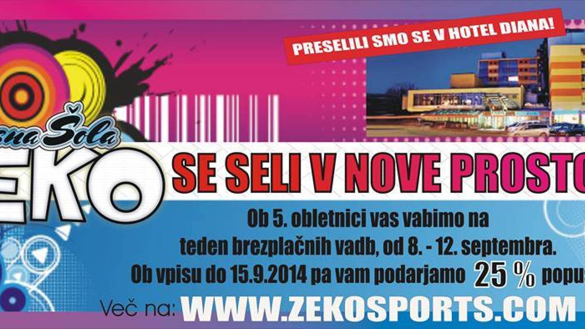 Plesna šola ZEKO Hotel Diana Murska SobotaOb jubilejni 5. obletnici delovanja Plesne šole in Plesnega kluba ZEKO, se v celoti selimo v prenovljene prostore v Hotel Diana Murska Sobota .