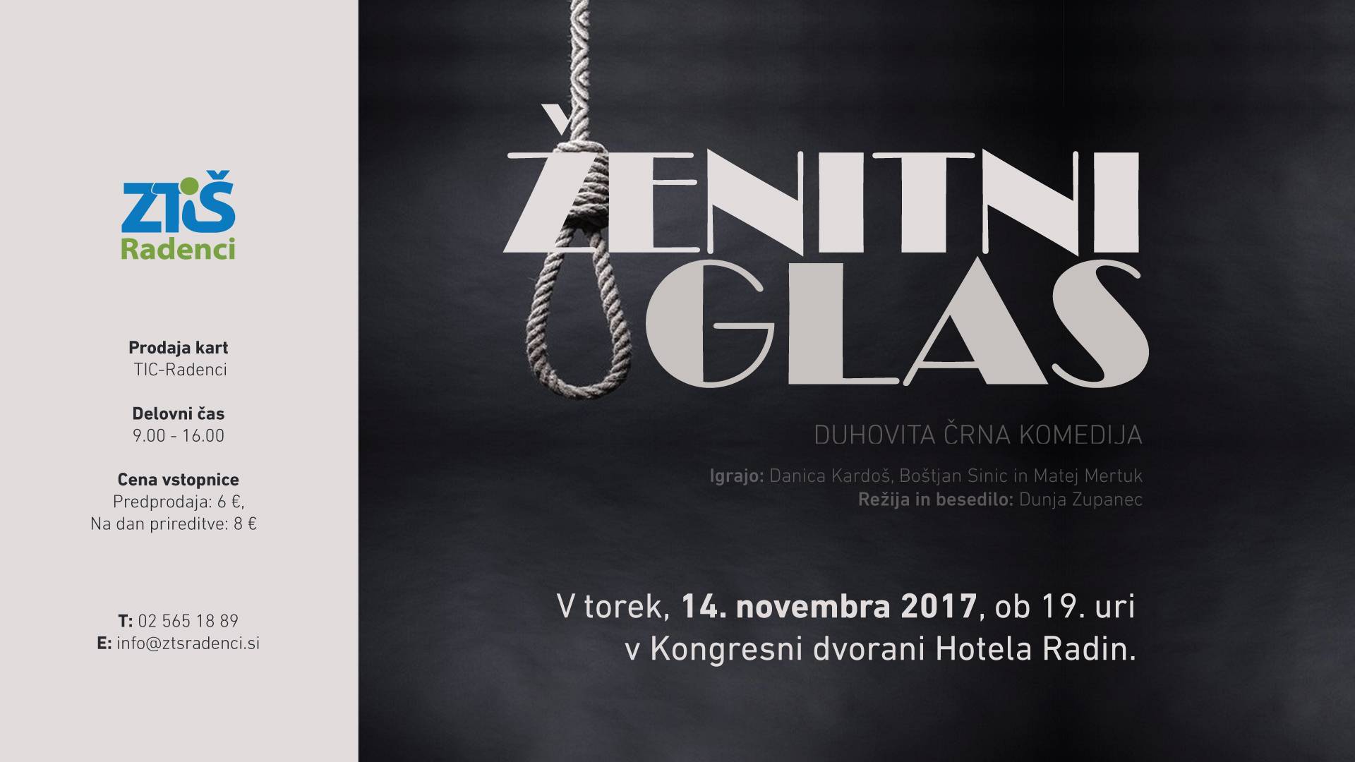 Kongresna dvorana hotela RadinPo slabih dveh letih se vračata MACHO IN MEJKE na odrske deske s samostojno predstavo, ki pa vseeno ni tako samostojna. V veliko zadovoljstvo njima je, da ju je k sodelovanju povabila diplomirana igralka in tekstopiska Dunja Zupanec. Deluje že vrsto let v SNG Drama Ljubljana, SNG Drama Maribor, Mestno gledališče Koper ter Ptuj, Lutkovno gledališče Maribor, Talija v Celju, Off produkcije z Živadinovom, JSKD..., sinhronizira risane junake na RTV Slovenija in POP TV in še bi lahko naštevali. Sedaj pa tudi s Kulturnim društvom MIM, kjer se njima bo na odru pridružila še dolgoletna prijateljica, igralka in režiserka Danica Kardoš.