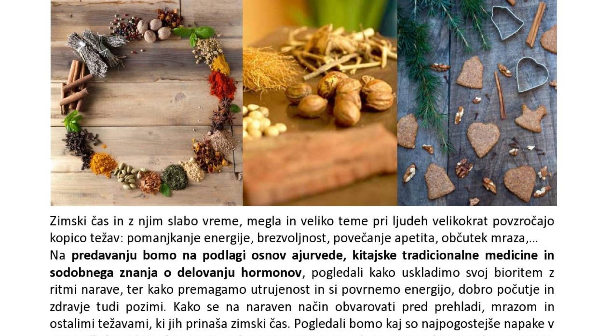 Na predavanju bomo na podlagi osnov ajurvede, kitajske tradicionalne medicine in sodobnega znanja o delovanju hormonov, pogledali kako uskladimo svoj bioritem z ritmi narave, ter kako premagamo utrujenost in si povrnemo energijo, dobro počutje in zdravje tudi pozimi. Kako se na naraven način obvarovati pred prehladi, mrazom in ostalimi težavami, ki jih prinaša zimski čas. Pogledali bomo kaj so najpogostejše napake v zvezi z življenjskim slogom in prehrano pozimi, ter na kaj moramo biti posebno pozorni. Dobili bomo priporočila in veliko praktičnih nasvetov.