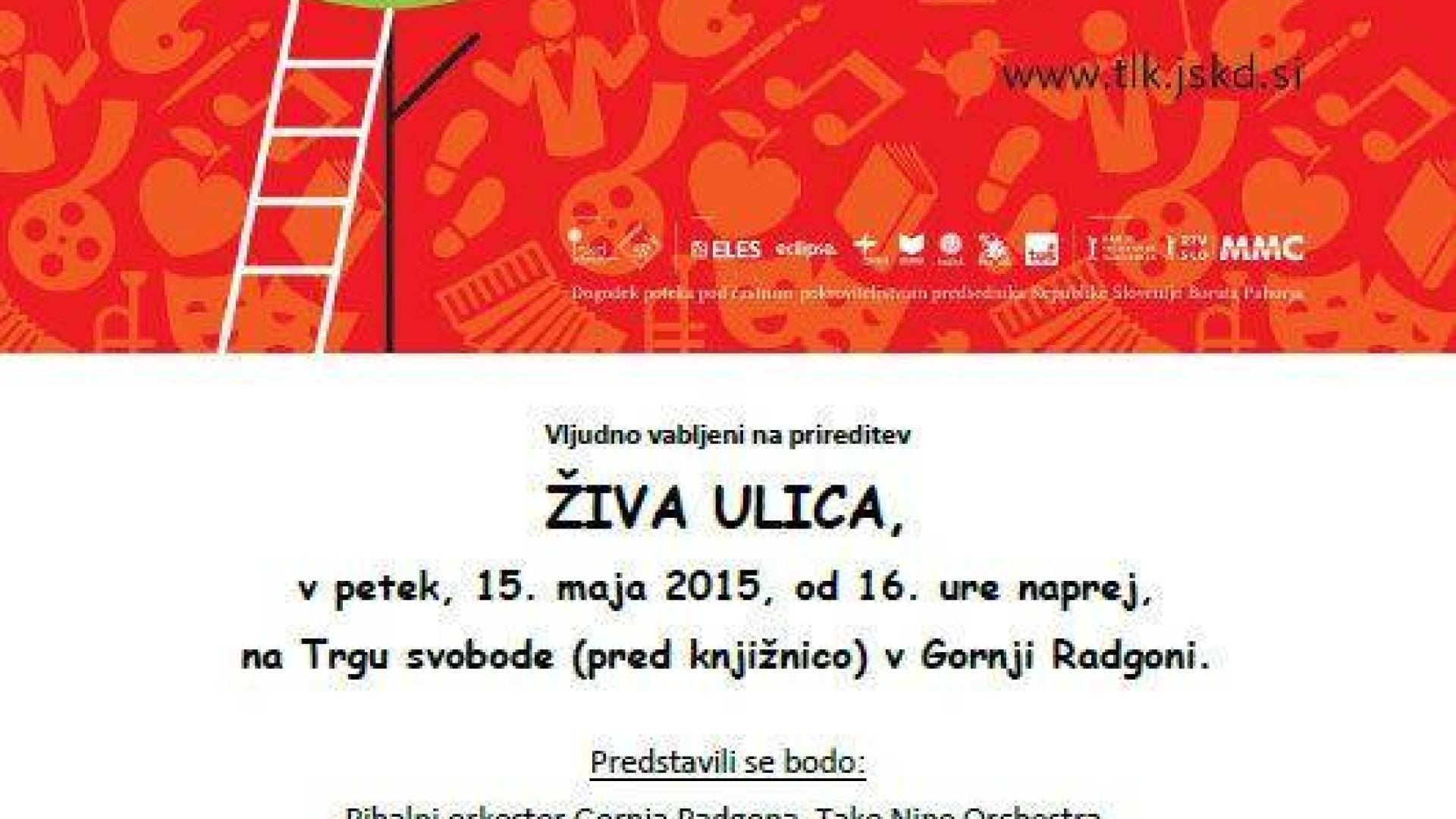 ŽIVA ULICA - prireditev v sklopu Tedna ljubiteljske kulture OI JSKD G. Radgona | 11. maj 2015 10:55 v Termin Petek, 15. maj 2015 16:00 - Petek, 15. maj 2015 18:00 Lokacija Gornja Radgona Prijazno vabljeni, da skupaj z nami proslavite ljubiteljsko kulturo!